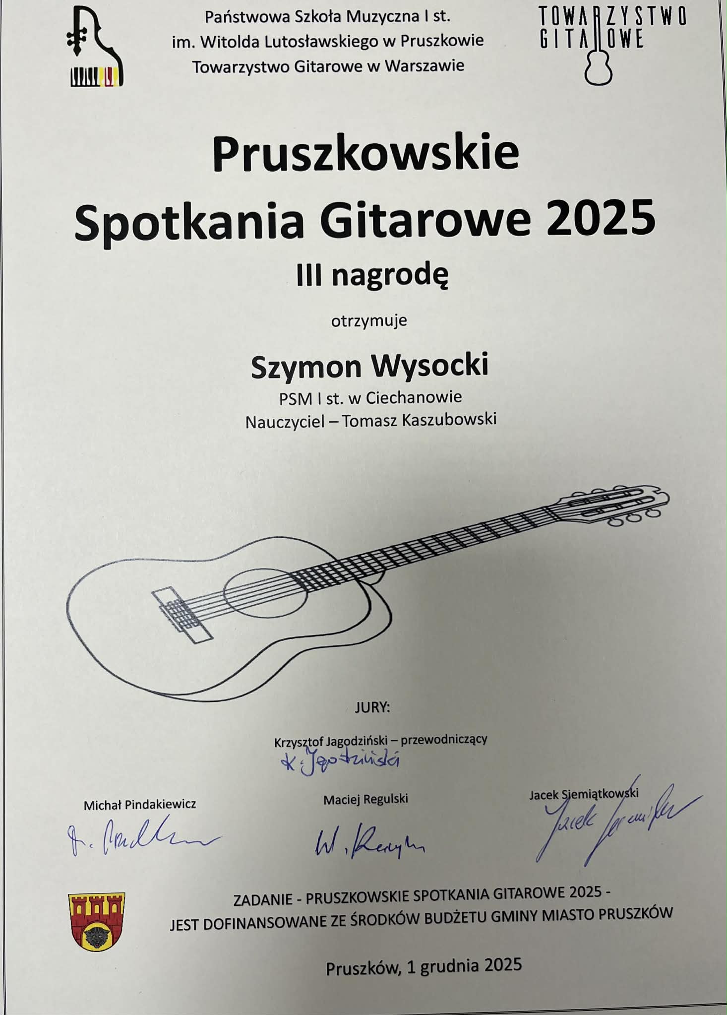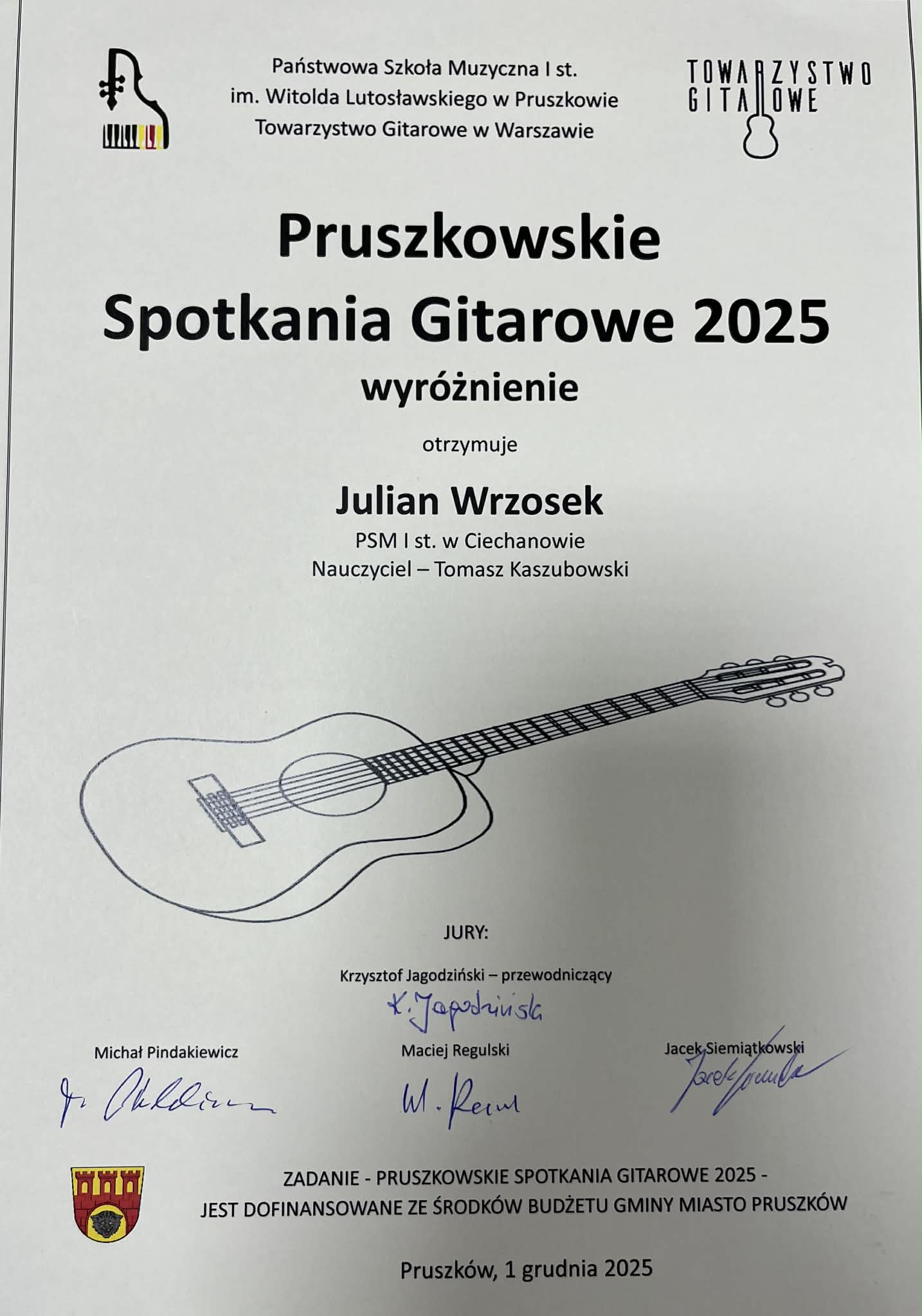 Miło nam poinformować o kolejnych sukcesach naszych uczniów. Tym razem uczniowie klasy gitary Pana Tomasza Kaszubowskiego zdobyli nagrody w Pruszkowskich Spotkaniach Gitarowych 2025. Szymon Wysocki III Nagrodę oraz Julian Wrzosek Wyróżnienie.