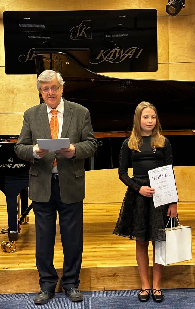 W I kategorii wiekowej nasza uczennica Alicja Pabich z klasy V fortepianu Pani Tatiany Fedorczuk-Eichler zdobyła III Nagrodę ( I Nagrody nie przyznano). W dniu wczorajszym Alicja odebrała Dyplom wraz z nagrodą z rąk Przewodniczącego Jury Pana prof. Piotra Palecznego.