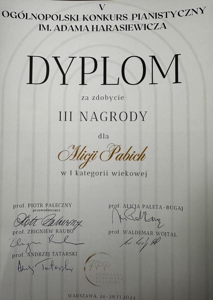 W dniach 26-28 listopada 2024r. w Warszawie odbył się V Ogólnopolski Konkurs Pianistyczny im. Adama Harasiewicza.