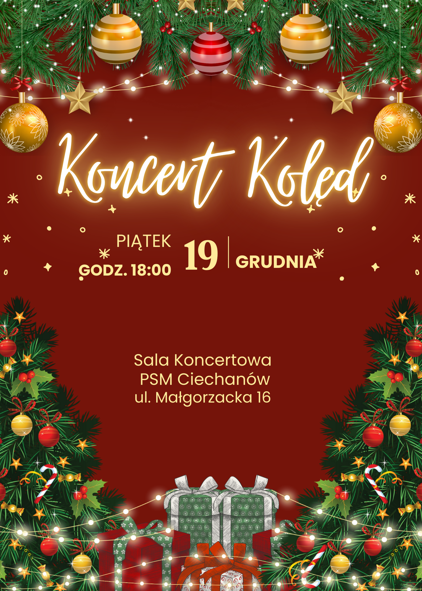 Państwowa Szkoła Muzyczna I st. im. Stanisława Moniuszki w Ciechanowie zaprasza na Koncert kolęd w dniu 19 grudnia tj. piątek o godz. 18:00. Koncert odbędzie się w Sali koncertowej PSM Ciechanów przy ul. Małgorzackiej 16. Wstęp wolny.