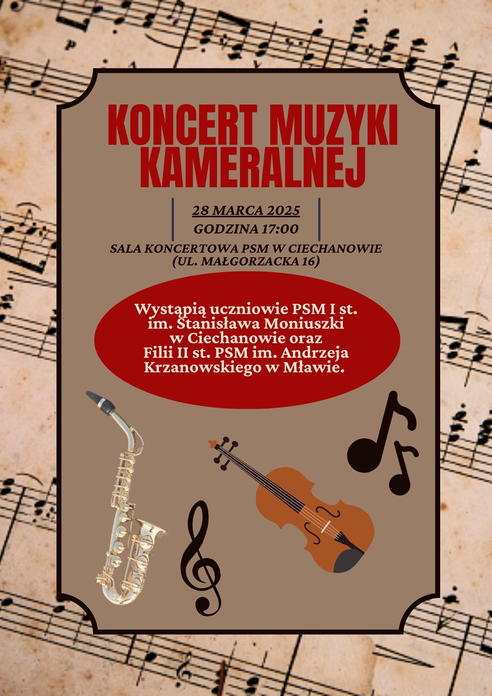 Serdecznie zapraszamy na Koncert Muzyki Kameralnej, który odbędzie się w dniu 28.03.2025r. o godz. 17:00 w wykonaniu uczniow PSM I st. oraz Filii II st.