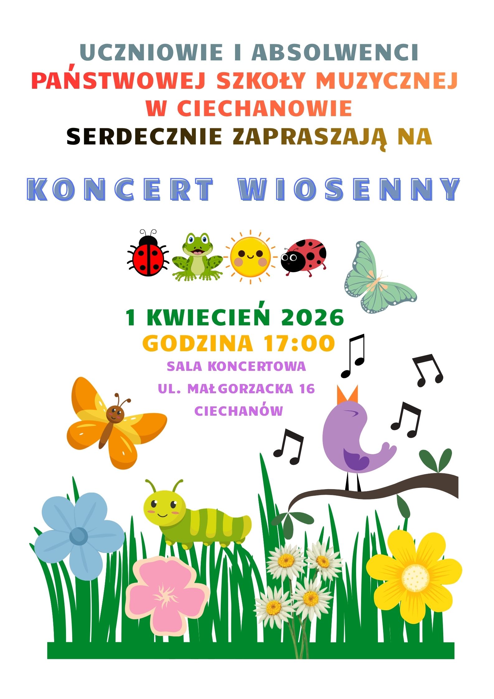 Państwowa Szkoła Muzyczna I st. im. Stanisława Moniuszki w Ciechanowie zaprasza na Koncert Wiosenny w wykonaniu uczniów i absolwentów PSM dn. 1 kwietnia tj. środa o godz. 17:00. Koncert odbędzie się w Sali koncertowej PSM Ciechanów przy ul. Małgorzackiej 16. Wstęp wolny.