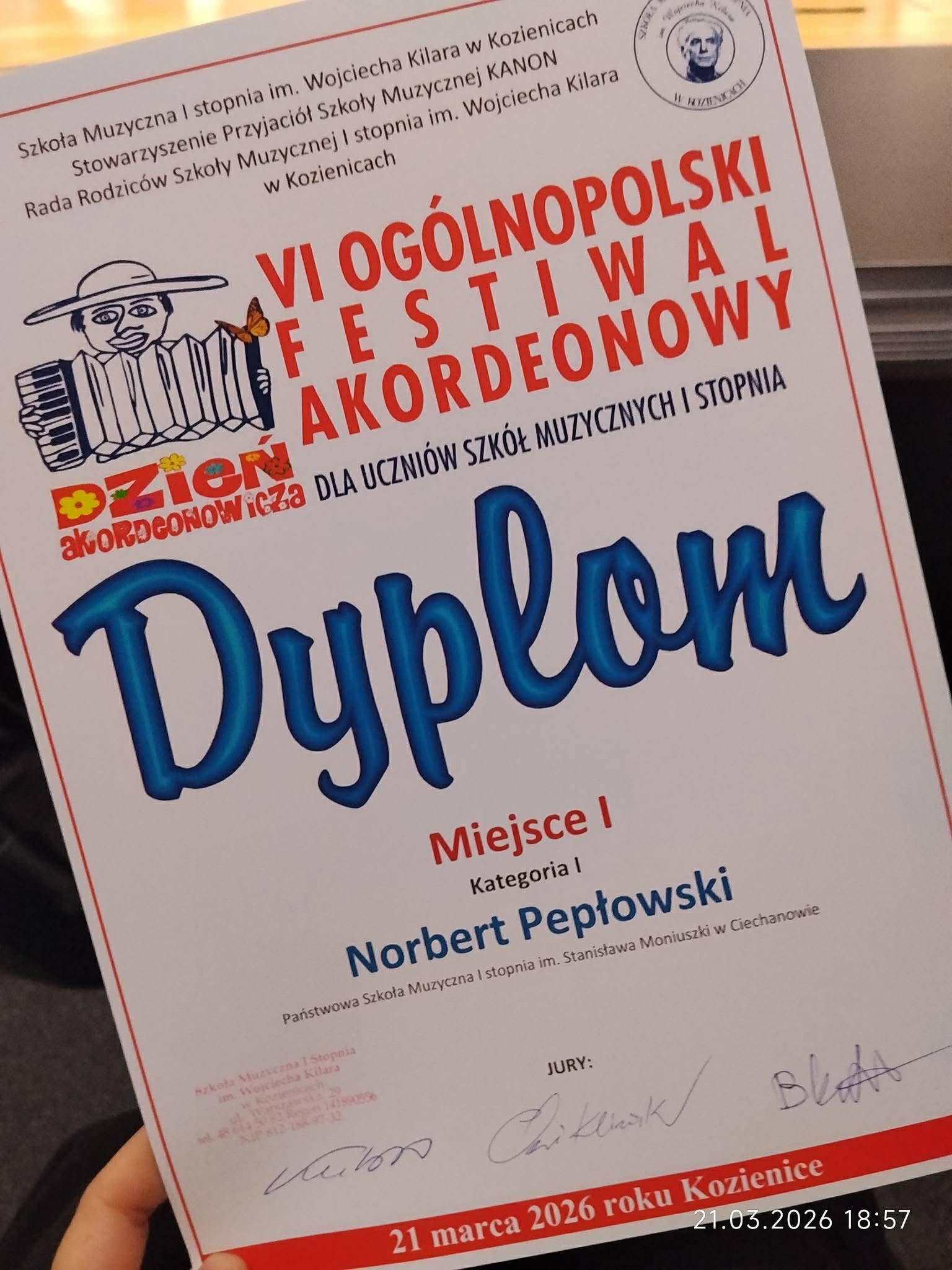 Z ogromna dumą składamy serdeczne gratulację uczniom Pana Piotra Tomali - Norbertowi Pepłowskiemu ( w kat. I) oraz Katarzynie Rutkiewicz ( w kat. II) za zdobycie PIERWSZYCH miejsc w VI Ogólnopolskim Festiwalu Akordeonowym „Dzień Akordeonowicza” w Kozienicach.