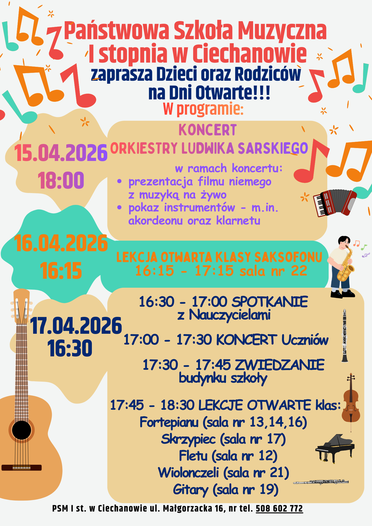 • Kandydaci sami dokonują wyboru instrumentu, na którym podejmą naukę w danym cyklu kształcenia. Kandydaci maja prawo skorzystać z Dni Otwartych – 15 kwietnia 2026r. 18:00 – koncert; 16 kwietnia 2026r. – od godz. 16:15; 17 kwietnia 2026r. – od godz. 16:30 ( w załączeniu plakat).
