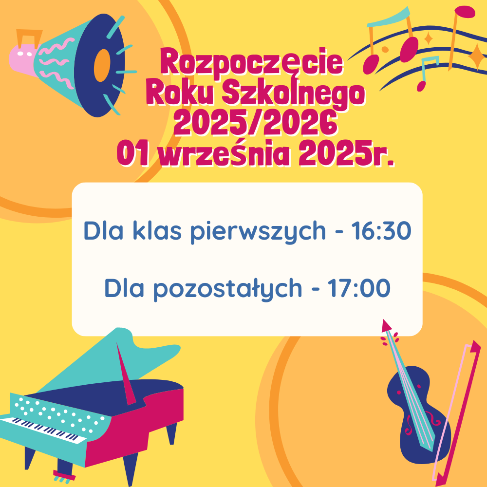 Rozpoczęcie Roku Szkolnego 2025/2025 odbędzie się dnia 01 września 2025r. na sali koncertowej wg harmonogramu: