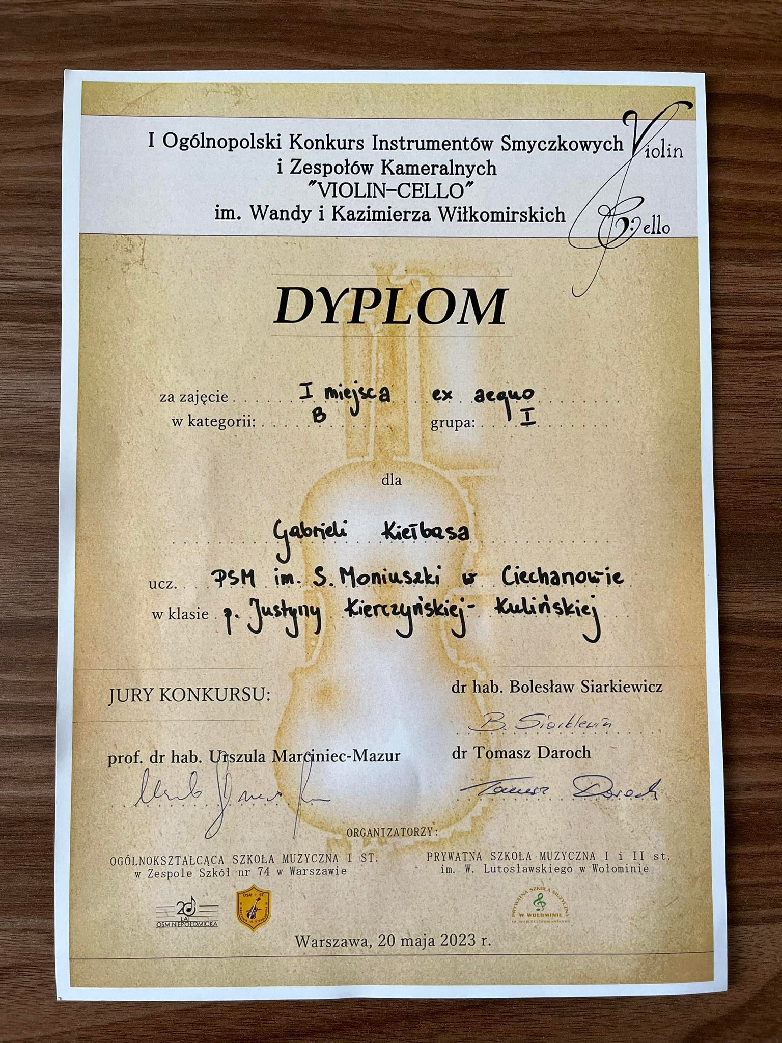 Gabrysia zdobyła I miejsce (ex. Aequo) w I Ogólnopolskim Konkursie Instrumentów Smyczkowych i Zespołów Kameralnych „Violin-Cello” im. Wandy i Kazimierza Wiłkomirskich w Warszawie.