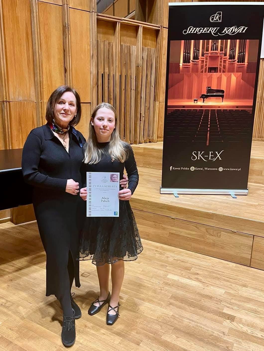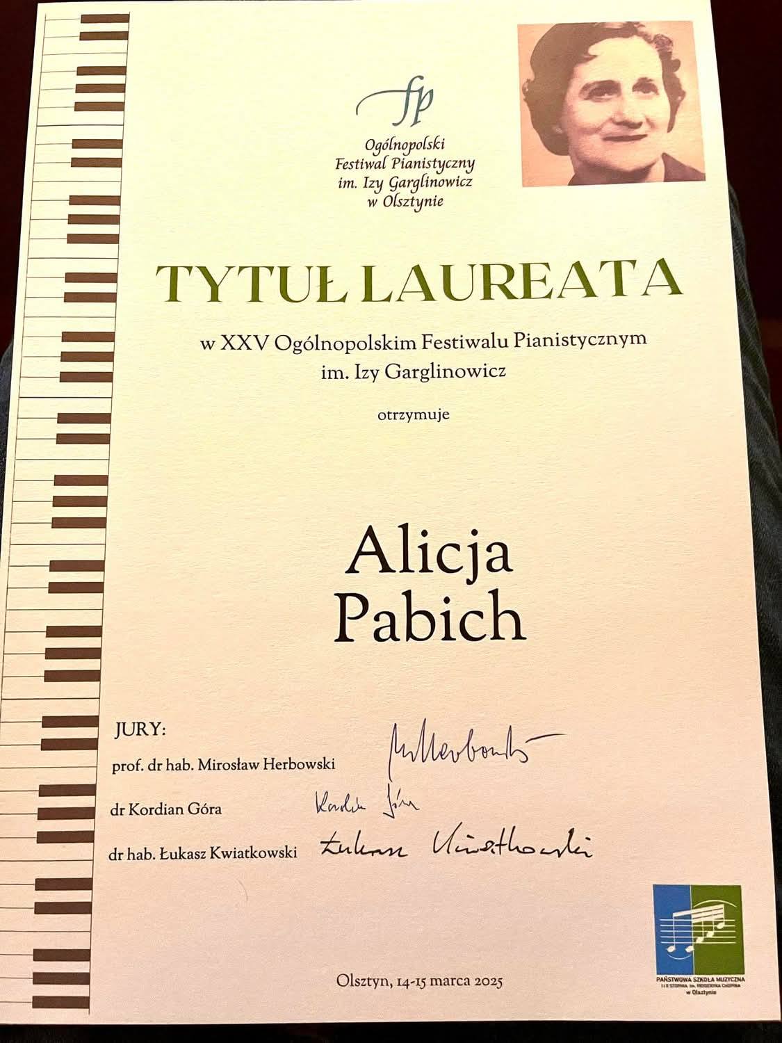 Miło nam poinformować o kolejnym sukcesie naszej uczennicy Alicji Pabich z klasy fortepianu Pani Tatiany Fedorczuk-Eichler. Tym razem Alicja otrzymała Tytuł Laureata w XXV Ogólnopolskim Festiwalu Pianistycznym im. Izy Garglinowicz w Olsztynie.