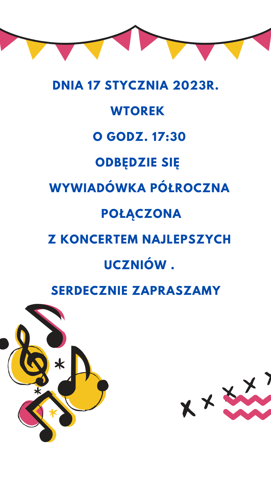 Dnia 17 stycznia 2023r. (wtorek) o godz. 17:30 na Sali koncertowej odbędzie się wywiadówka półroczna połączona z KONCERTEM najlepszych uczniów .