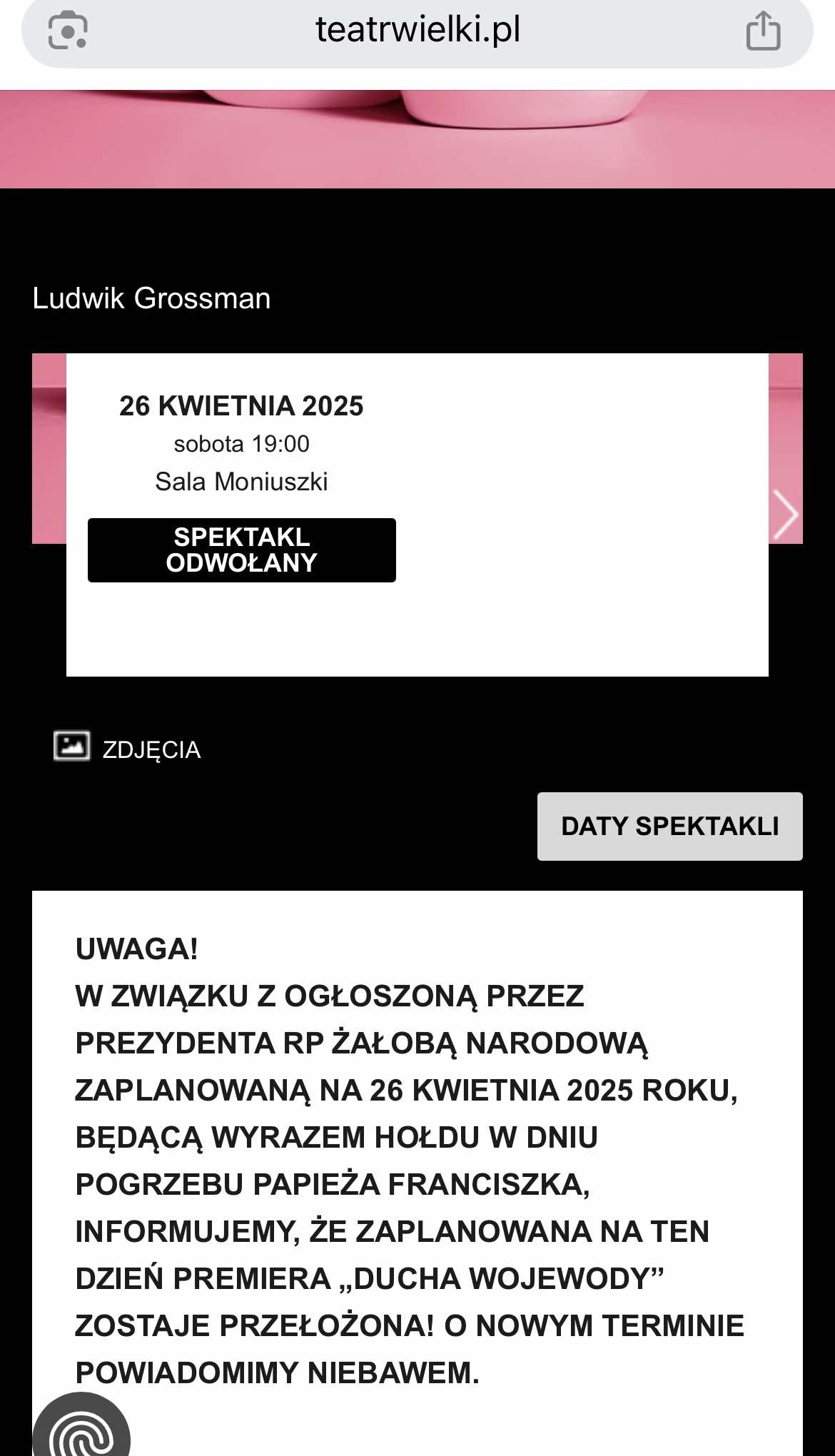 W związku z ogłoszoną przez Prezydenta RP żałobą narodową w dniu 26 kwietnia 2025 roku , informujemy, że zaplanowana na ten dzień wycieczka do Warszawy do Opery Narodowej na premierę „Ducha Wojewody” zostaje przełożona! Czekamy na ogłoszenie nowego terminu.