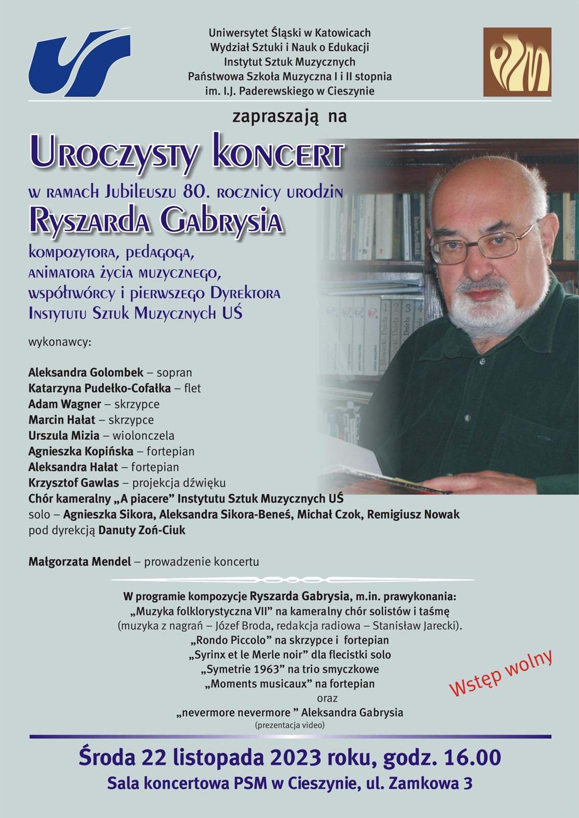 Zapraszamy serdecznie na uroczysty koncert w ramach obchodów Jubileuszu 80 rocznych urodzin prof. Ryszarda Gabrysia.
