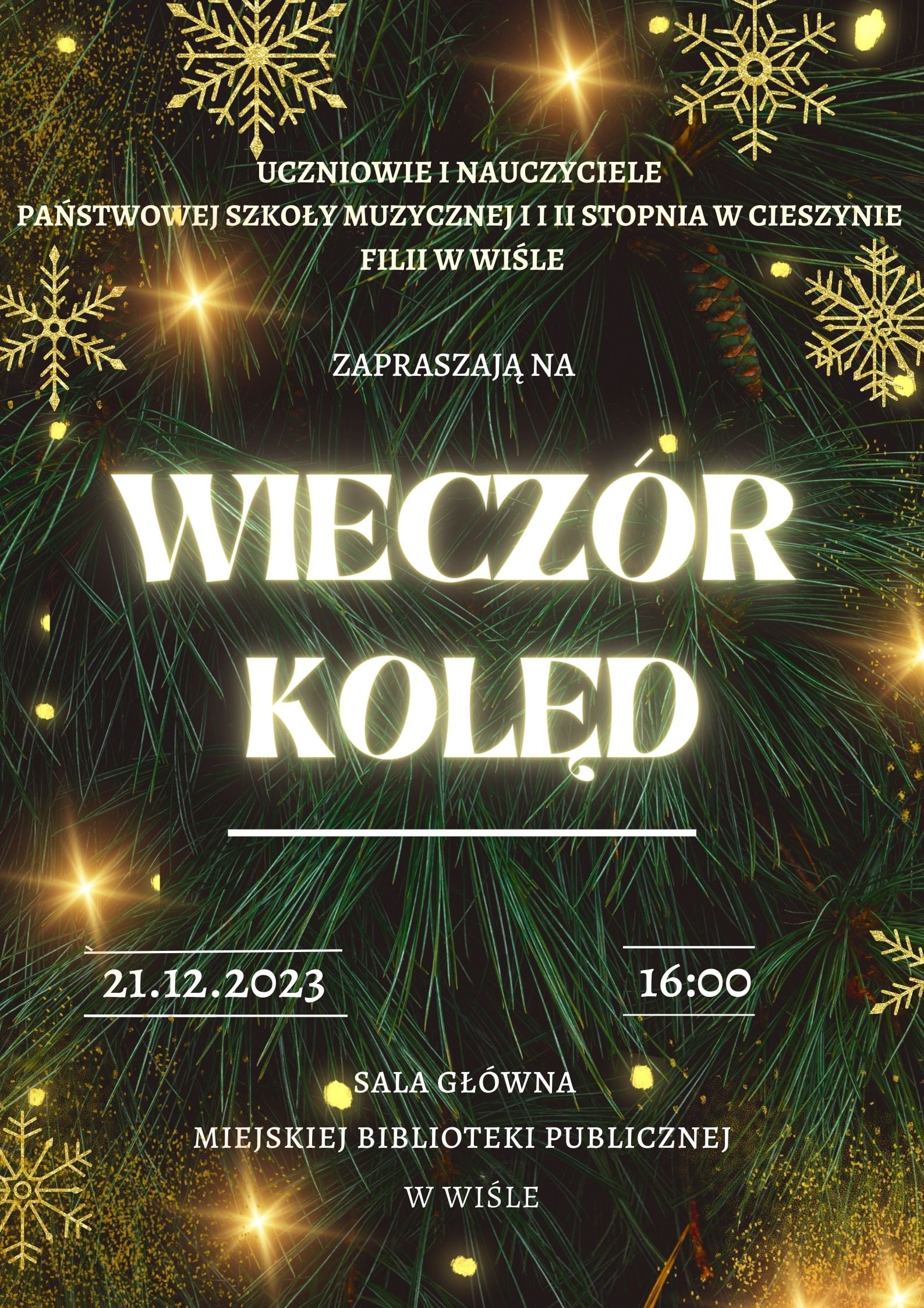 19.12.2023 o 16:30 w Cieszyńskim Ośrodku Kultury zaprezentują się soliści oraz zespoły PSM w Cieszynie z repertuarem kolędowym, a 21.12.2023 o 16:00 w Sali Biblioteki w Wiśle wystąpią uczniowie wiślańskiej filii.