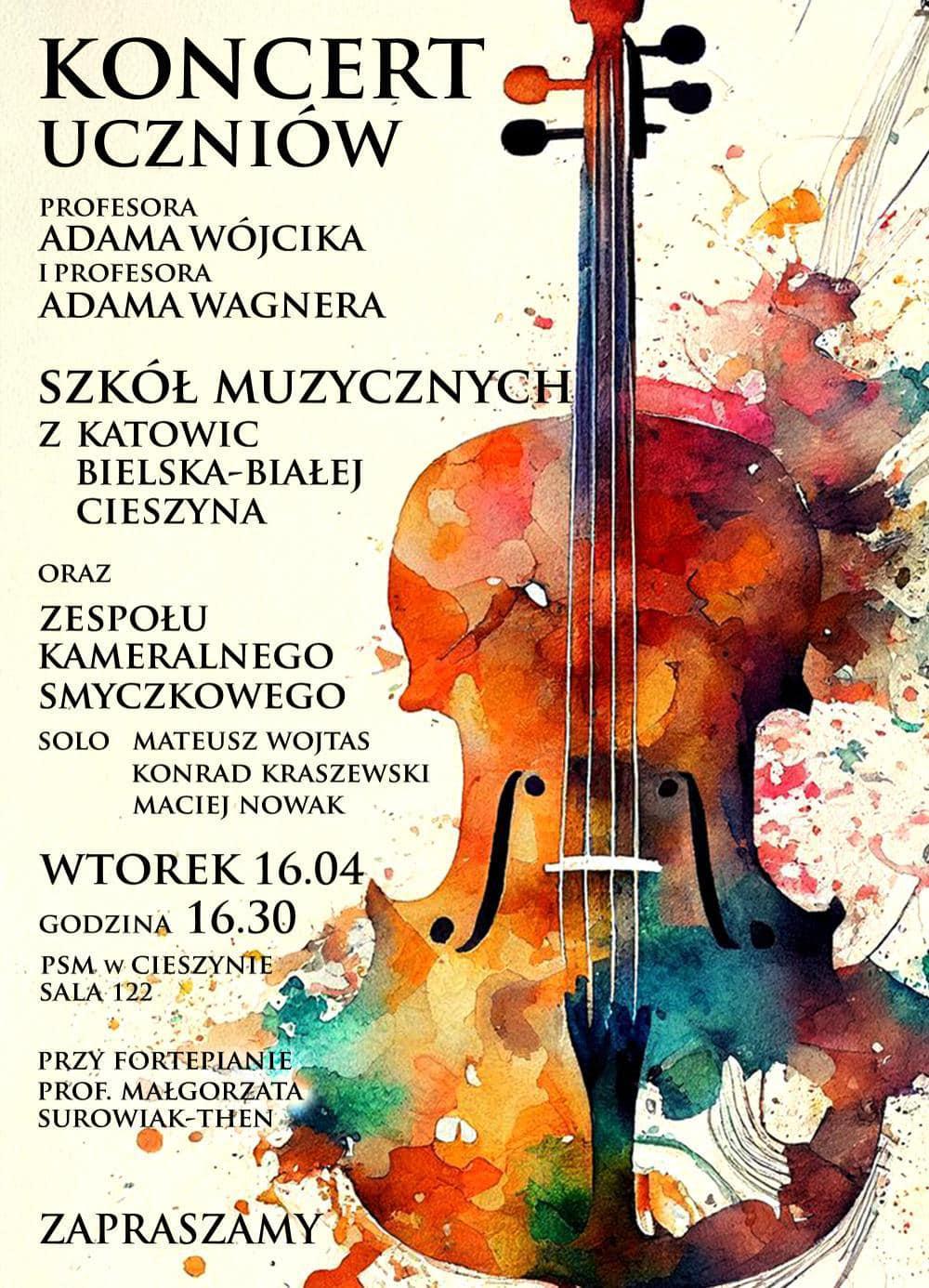 Zapraszamy koncert uczniów klas skrzypiec prof. Adama Wagnera oraz prof. Adama Wójcika ze szkół muzycznych z Bielska, Katowic oraz naszej cieszyńskiej Szkoły.