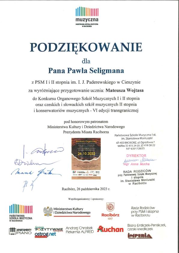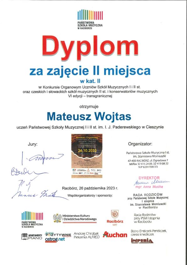 Mateusz Wojtas - uczeń III klasy PSM II stopnia z klasy organów mgr Pawła Seligmana wziął udział w VI edycji transgranicznej Konkursu Organowego dla Uczniów Szkół Muzycznych I i II st. w Raciborzu. Młody organista otrzymał II miejsce w swojej kategorii wiekowej. Serdecznie gratulujemy sukcesu Mateuszowi oraz panu Pawłowi i trzymamy kciuka za kolejne artystyczne laury :)