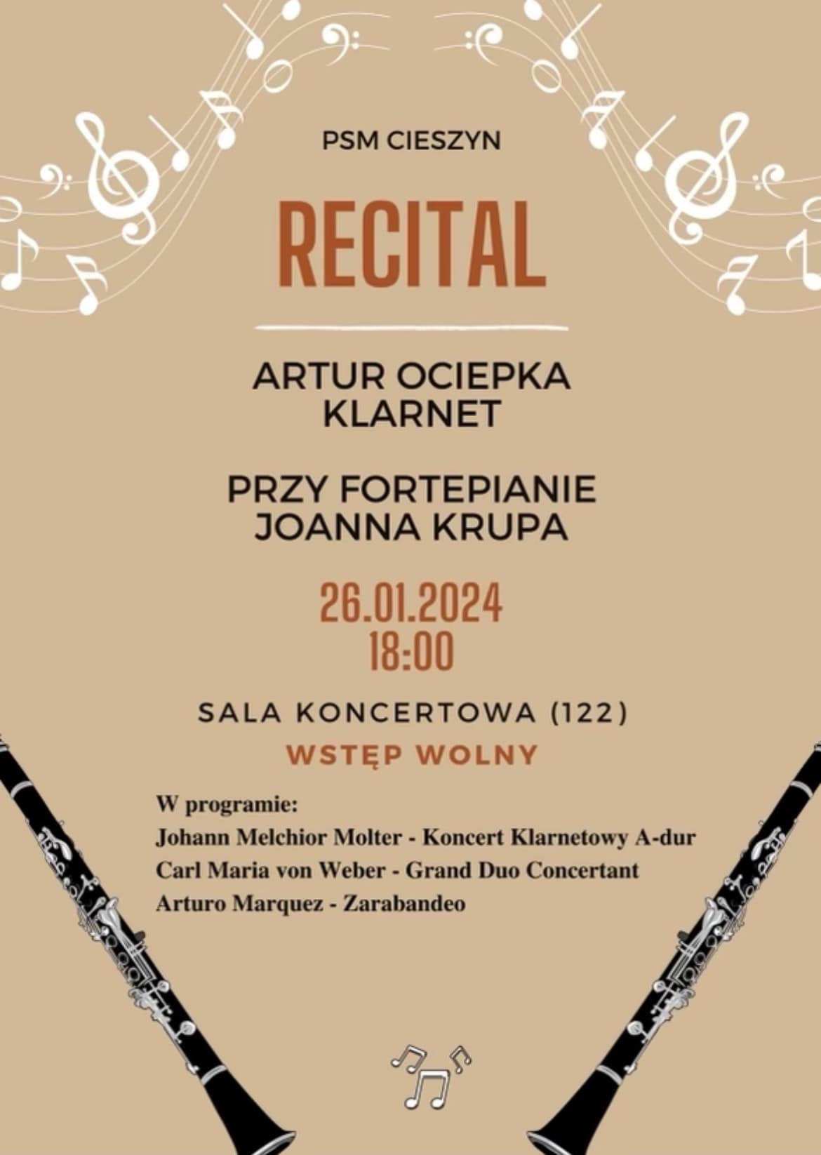 Serdecznie zapraszamy na Recital naszego nauczyciela - Artura Ociepki, który odbędzie się 26.01.2024 (piątek) o godzinie 18:00 w sali koncertowej 122 Państwowej Szkoły Muzycznej w Cieszynie.