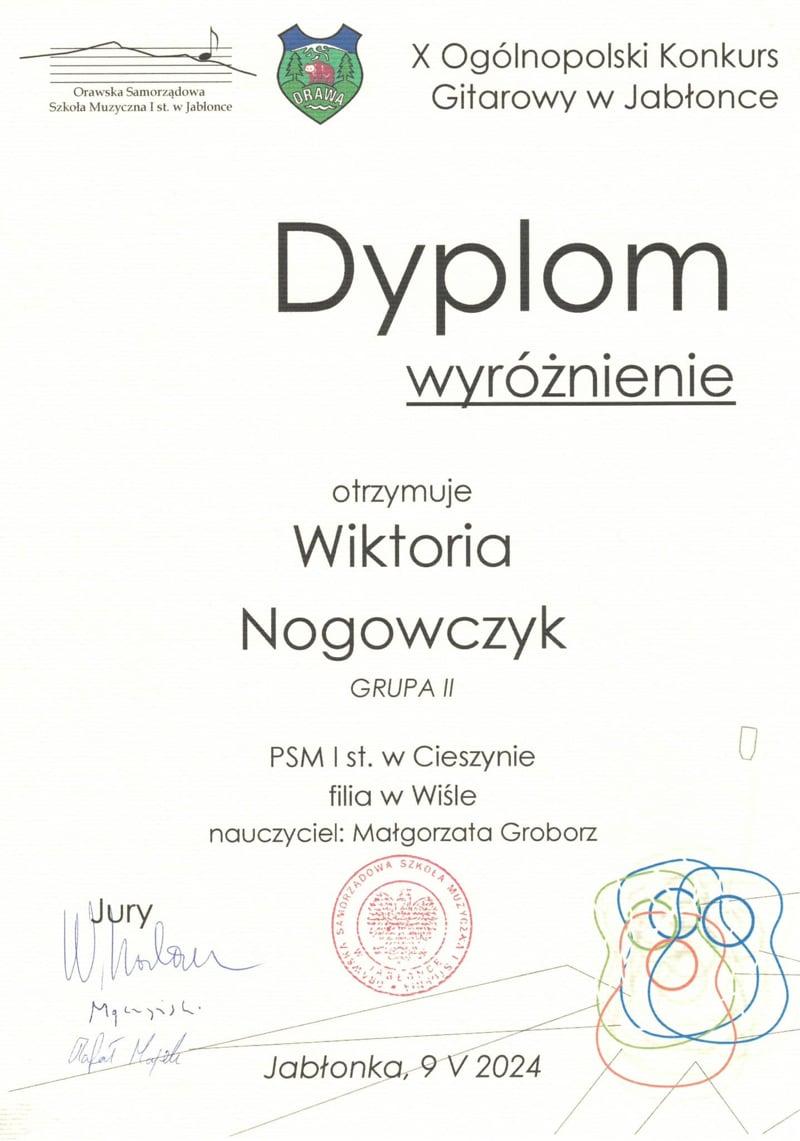 Wiktoria Nogowczyk, uczennica klasy gitary pani Ma艂gorzaty Groborz PSM I st. filii w Wi艣le uzyska艂a wyró偶nienie na X Ogólnopolskim Konkursie Gitarowym w Jab艂once.