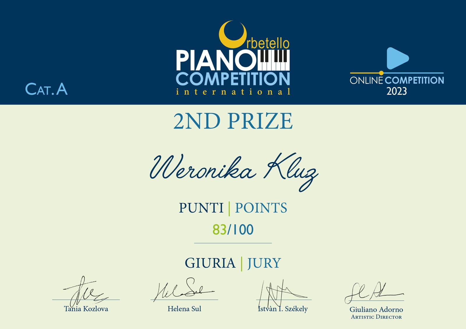 Weronika Kluz w tym roku dostarcza nam mnóstwo radości i powodów do dumy. 23.04.2023 r. uczennica wzięła udział w kolejnym Międzynarodowym Konkursie Pianistycznym w Orbetello we Włoszech. Nasza zdolna pianistka uzyskała bardzo dobre noty, otrzymując 2 nagrodę. Weronika rozwija się pianistyczne pod okiem mgr Marty Kowalczyk -Podsiadły. Gratulujemy uczennicy kolejnego sukcesu.