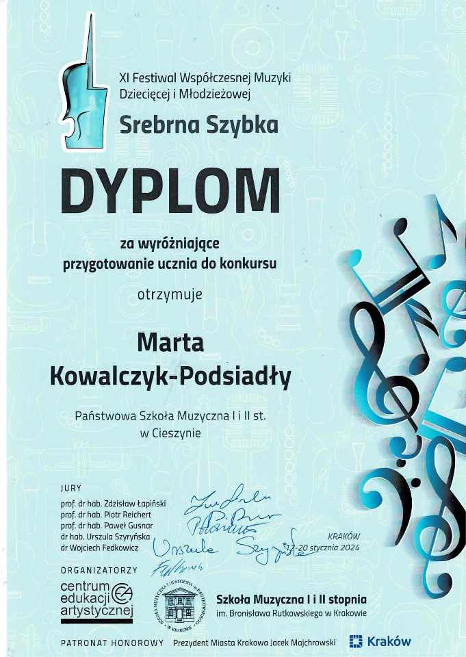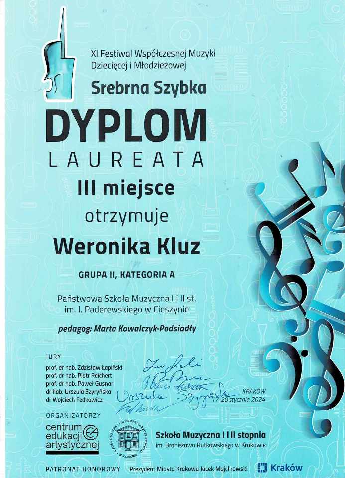 W dniach 17-20.1.24 r. odbył się XI Festiwal Współczesnej Muzyki Dziecięcej i Młodzieżowej Srebrna Szybka Kraków 2024, którego organizatorem było Centrum Edukacji Artystycznej. Jury podkreśliło bardzo wysoki poziom konkursu. Należy też przytoczyć słowa przewodniczącego jury prof. Z. Łapińskiego: "Nie byłoby tego konkursu bez Państwa ciężkiej pracy, docenia to nie tylko wasza dyrekcja, która płaci Wam pensję, ale również my — komisja festiwalu, jesteśmy wdzięczni za propagowanie muzyki współczesnej i włożony trud". Tym bardziej cieszymy się , że uczennica Weronika Kluz z klasy pani Marty Kowalczyk -Podsiadły otrzymała 3 miejsce w 2 grupie wiekowej. Pani Marta otrzymała dyplom za wyróżniające przygotowanie ucznia do konkursu.