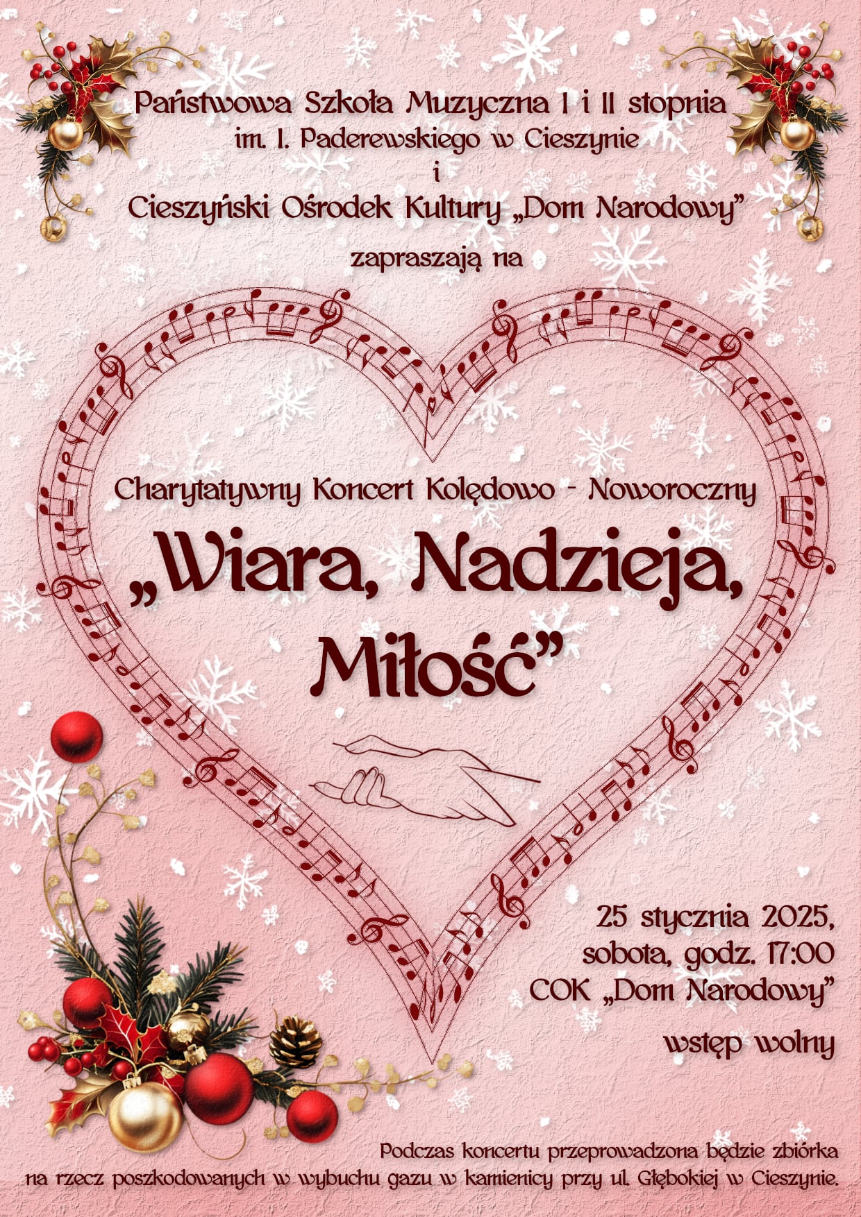 Państwowa Szkoła Muzyczna I i II stopnia im. I. Paderewskiego w Cieszynie oraz Cieszyński Ośrodek Kultury „Dom Narodowy” serdecznie zapraszają na wyjątkowy Charytatywny Koncert Kolędowo-Noworoczny, który odbędzie się w sobotę, 25 stycznia 2025 roku o godzinie 17:00 w Cieszyńskim Ośrodku Kultury „Dom Narodowy”.
