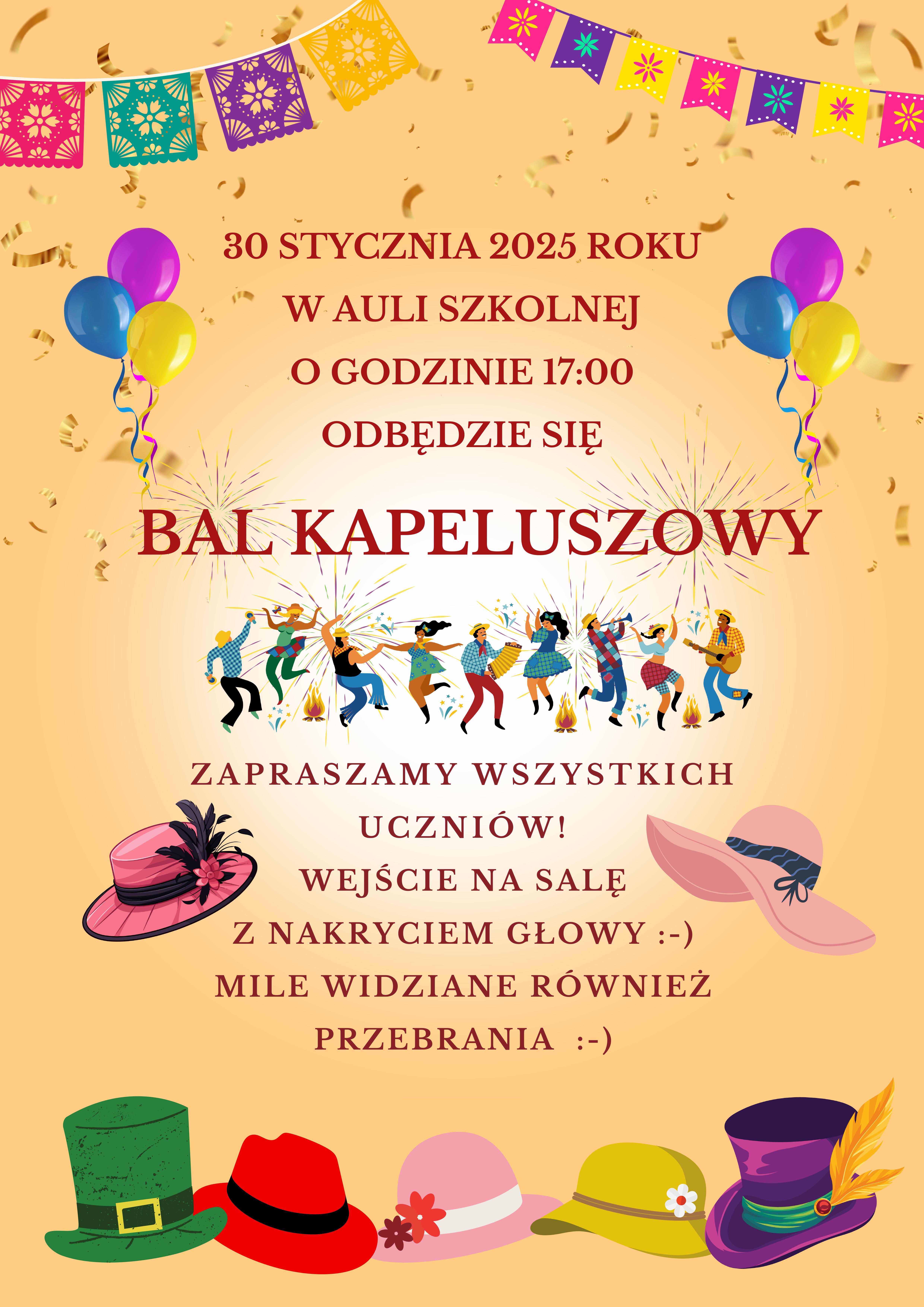 Plakat. Na żółtym tle rysunek kolorowych kapeluszy i tańczących ludzi oraz informacja "30 stycznia 2025 roku o godzinie 17:00 zapraszamy na Bal Kapeluszowy".