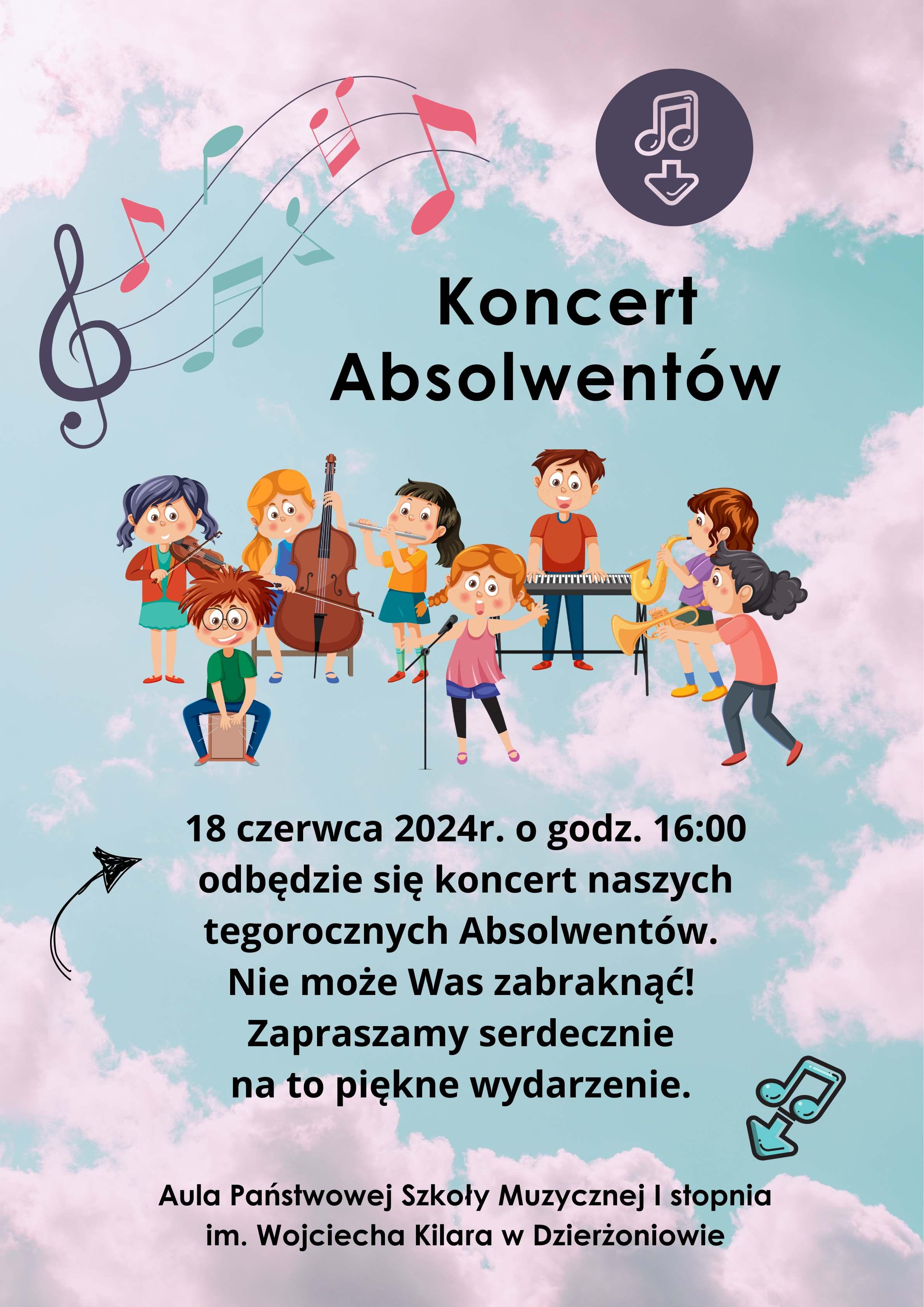 Plakat"Koncert Absolwentów". W tle na niebieskim niebie różowe chmurki. Od góry: w lewym rogu kolorowa pięciolinia z nutkami, na środku napis "Koncert absolwentów", poniżej rysunek dzieci grających na różnych instrumentach, pod spodem napis "18 czerwca 2024 r. o godz. 16:00 odbędzie się koncert naszych tegorocznych Absolwentów. Nie może Was zabraknąć! Zapraszamy serdecznie na to piękne wydarzenie. Aula Państwowej Szkoły Muzycznej I stopnia im. Wojciecha Kilara w Dzierżoniowie".