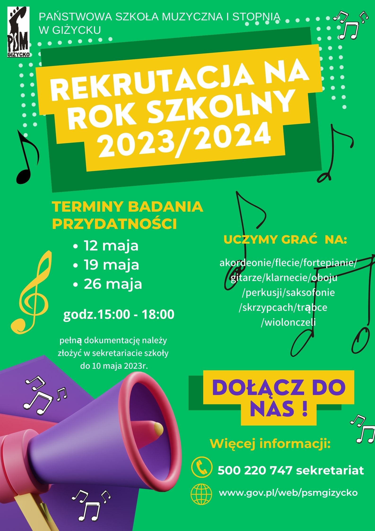 Uwaga Kandydaci !!! Przedłużamy przyjmowanie wniosków o przyjęcie do klasy pierwszej Państwowej Szkoły Muzycznej I stopnia w Giżycku do 26.05.2023r.