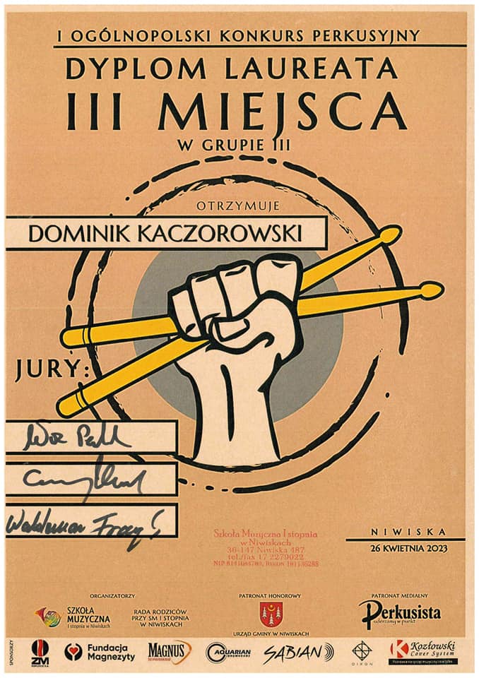 III miejsce otrzymał Dominik Kaczorowski z klasy pana Jana Weznera na I Ogólnopolskim Konkursie Perkusyjnym w Niwiskach 26 kwietnia 2023 r.