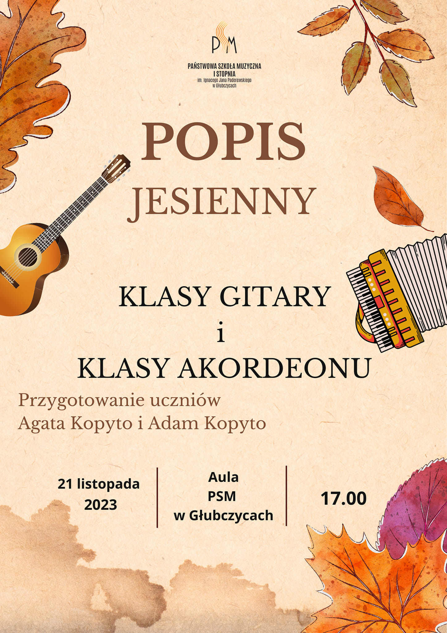 Popis klasy gitary pani Agaty Kopyto oraz klasy akordeonu pana Adama Kopyto, 21 listopada 2023 r. godzina 17:00 aula PSM