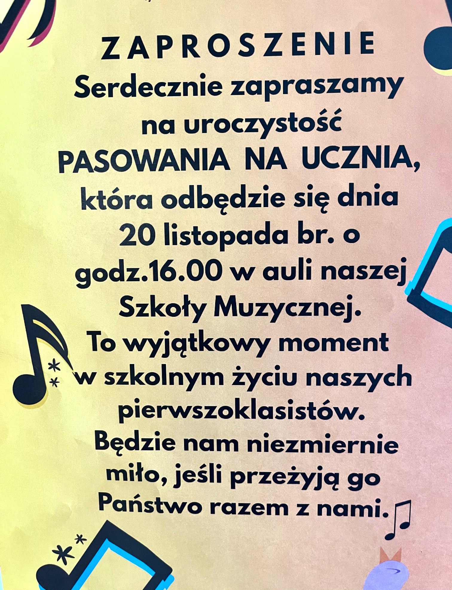 Uroczystość Pasowania na ucznia - 20 listopada 2025 r. godzina 16:00 aula PSM w Głubczycach