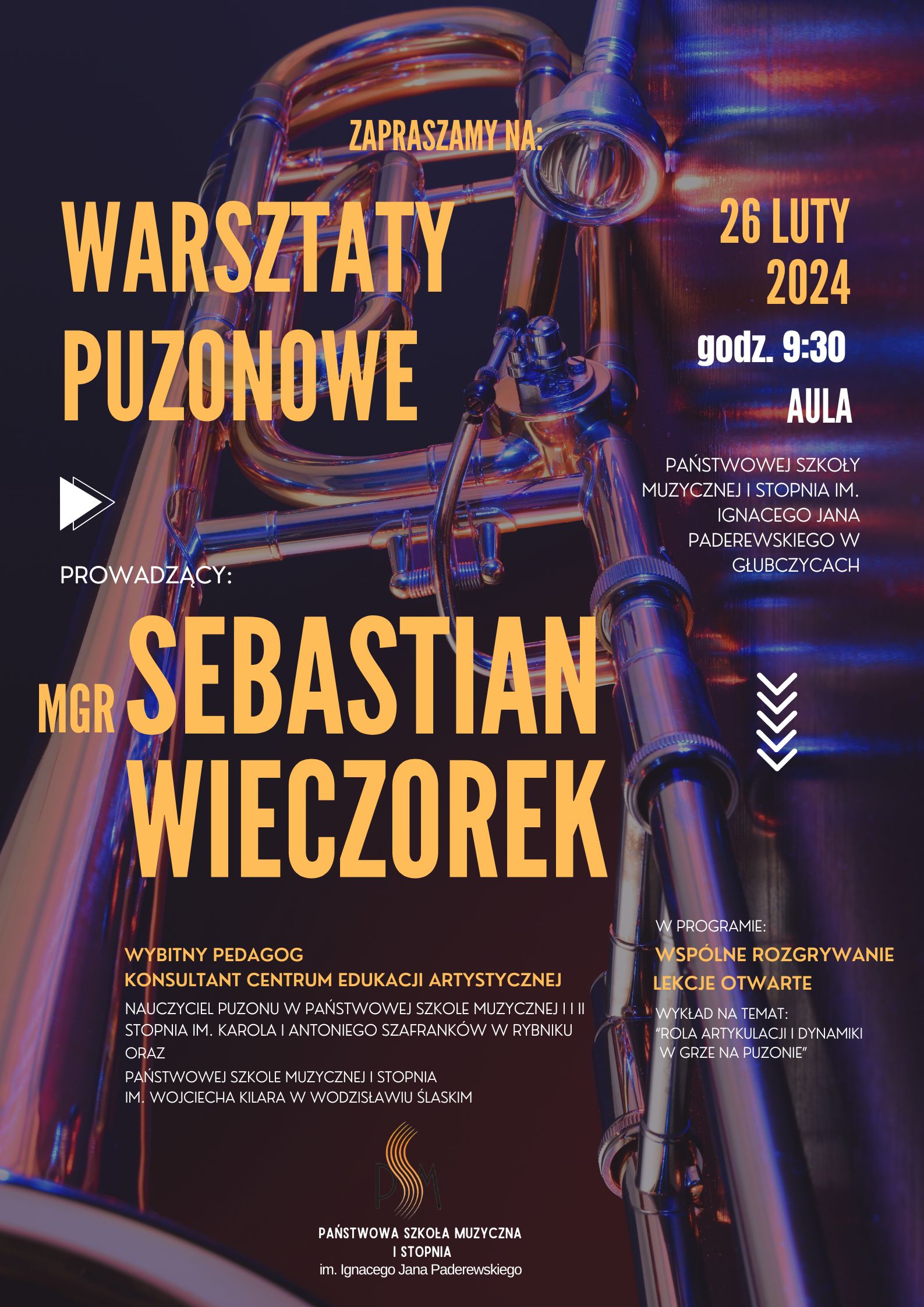 Warsztaty puzonowe - prowadzenie mgr Sebastian Wieczorek - 26 lutego 2024 r godz. 9:30 aula PSM w Głubczycach