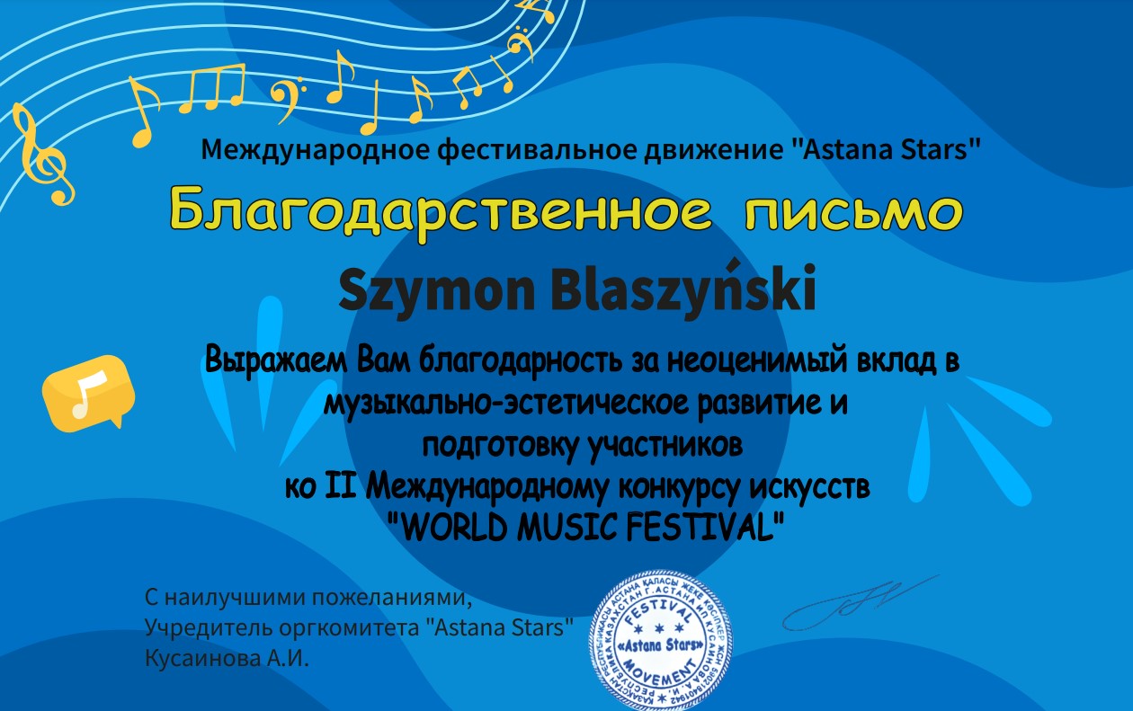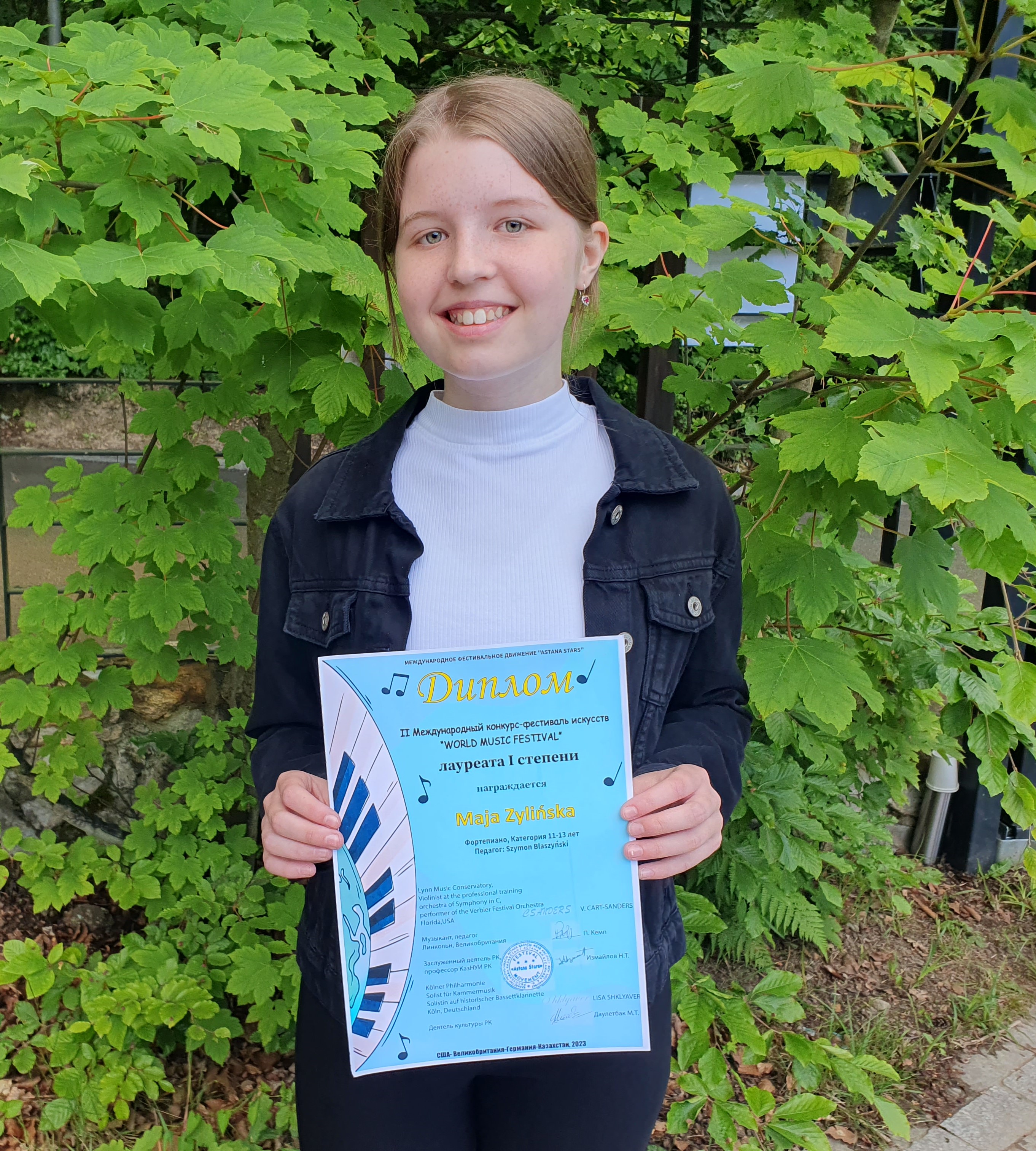 Nasza uczennica - Maja Zylińska z klasy V cyklu 6-letniego, z klasy fortepianu mgra Szymona Blaszyńskiego zdobyła na II Międzynarodowym konkursie - festiwalu w Astanie /Kazachstan/ "WORLD MUSIC FESTIWAL" Dyplom laureata I stopnia w grupie wiekowej 11-13 lat. Konkurs odbył się w formule online 15.06.2023.