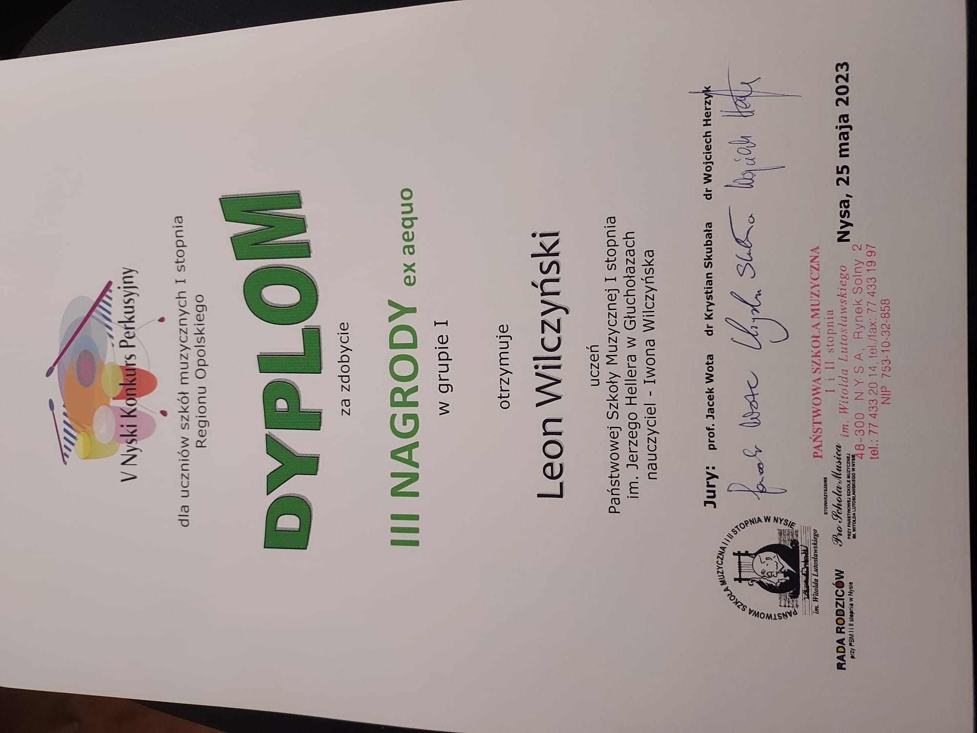 III Nagroda w grupie I Leona Wilczyńskiego na V Nyskim Konkursie Perkusyjnym 25.05.2023