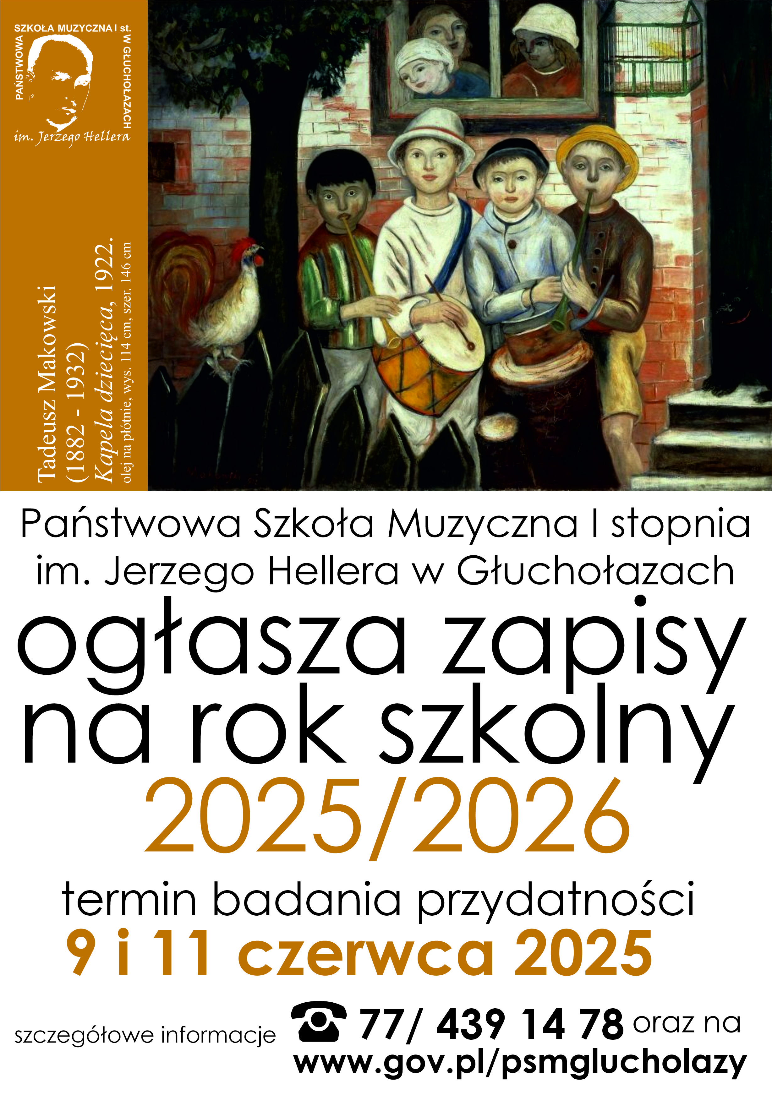 Tegoroczne badania przydatności do kształcenia odbędą się w dniach 9 - 25 czerwca 2025 r. w dacie i godzinie ustalonej indywidualnie, w budynku Państwowej Szkoły Muzycznej I stopnia im. Jerzego Hellera w Głuchołazach, ul. Bohaterów Warszawy 2 (kontakt z Państwem realizowany będzie przez sekretariat, po złożeniu wniosku kandydata/kandydatki).