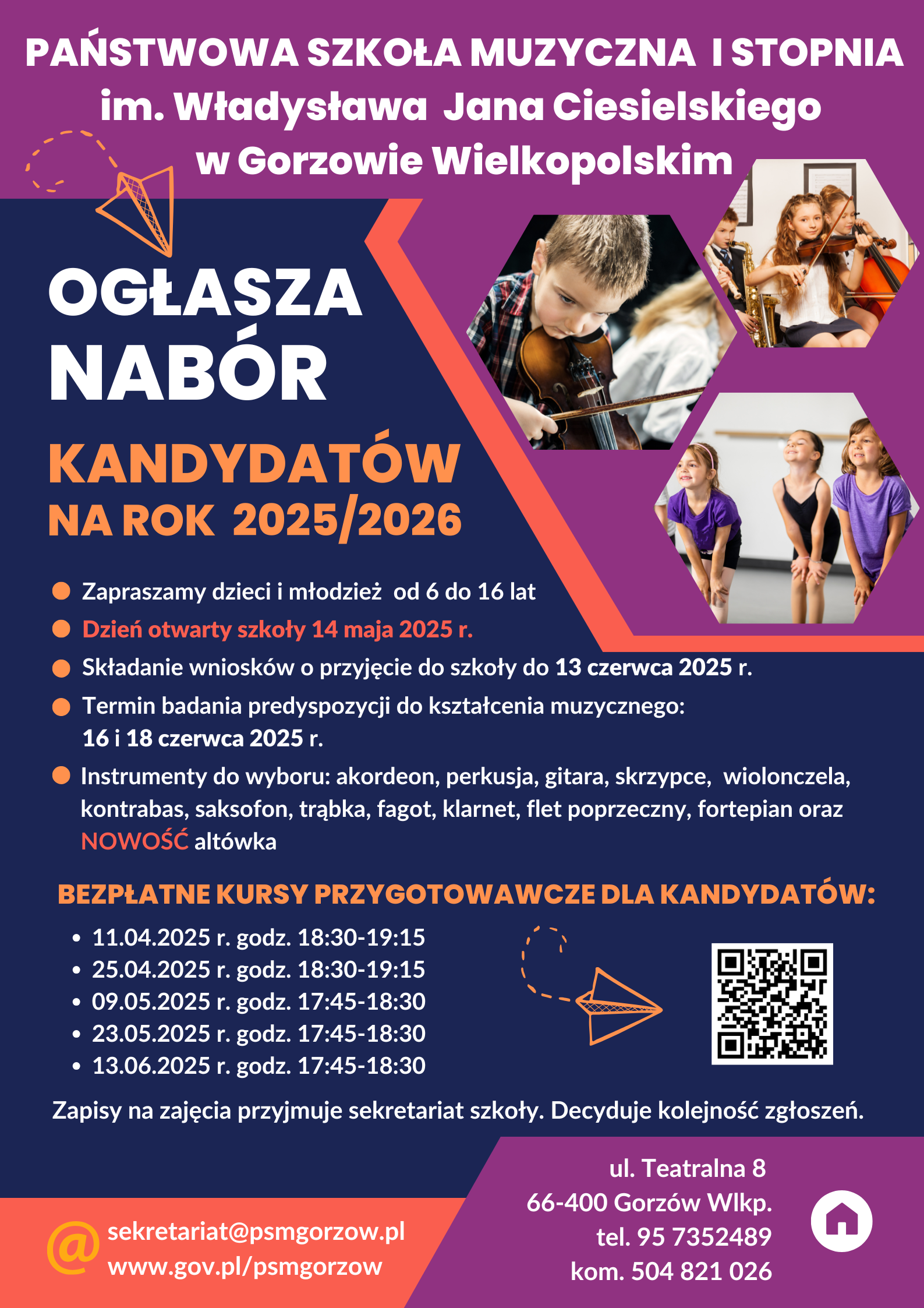 Dyrektor Państwowej Szkoły Muzycznej I stopnia imienia Władysława Jana Ciesielskiego w Gorzowie Wielkopolskim ogłasza rekrutację na rok szkolny 2025/2026