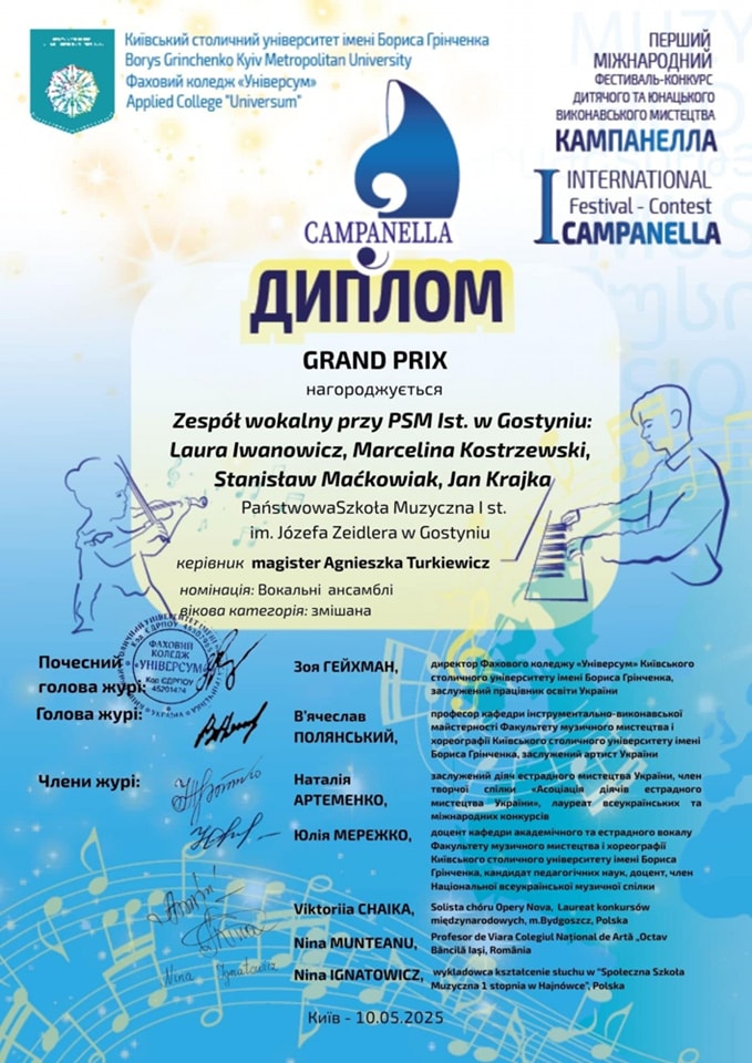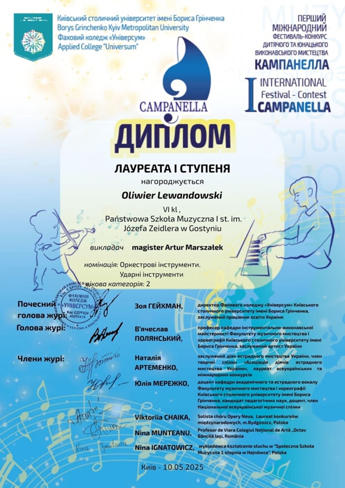 Podczas Międzynarodowego Konkursu "Campanella" zorganizowanego przez Kijów Metropolitan Univeritet im. Borysa Grinczenki przyznano uczniom naszej szkoły następujące nagrody: