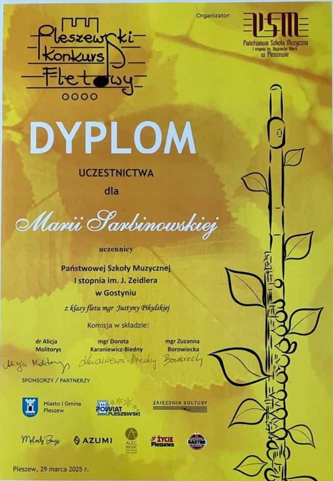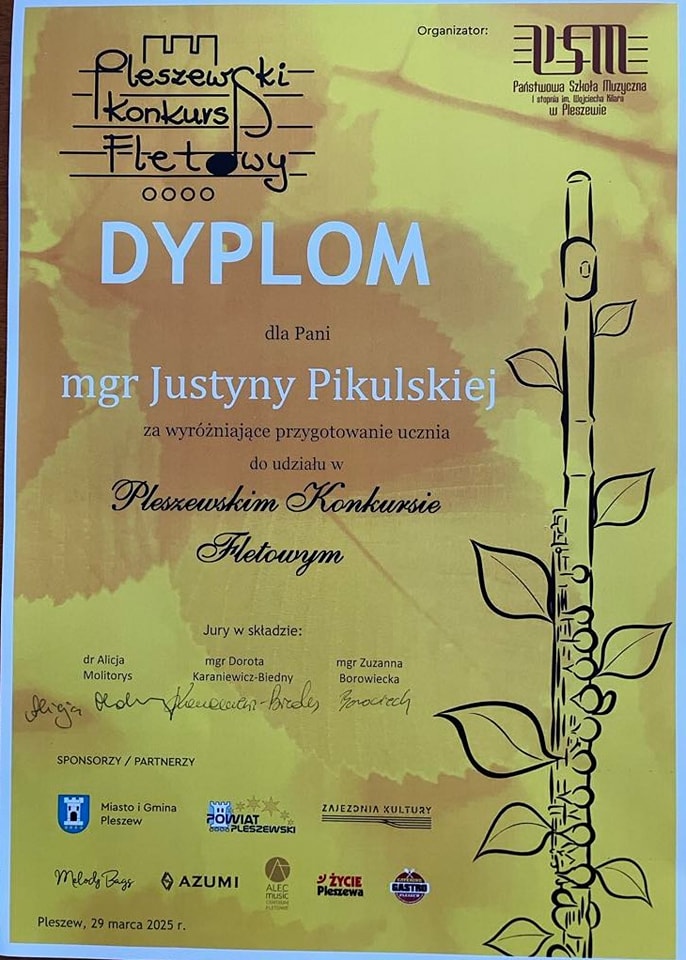 29 marca w Pleszewie odbył się „IV Pleszewski Konkurs Fletowy”. Wzięły w nim udział uczennice klasy fletu mgr Justyny Pikulskiej.