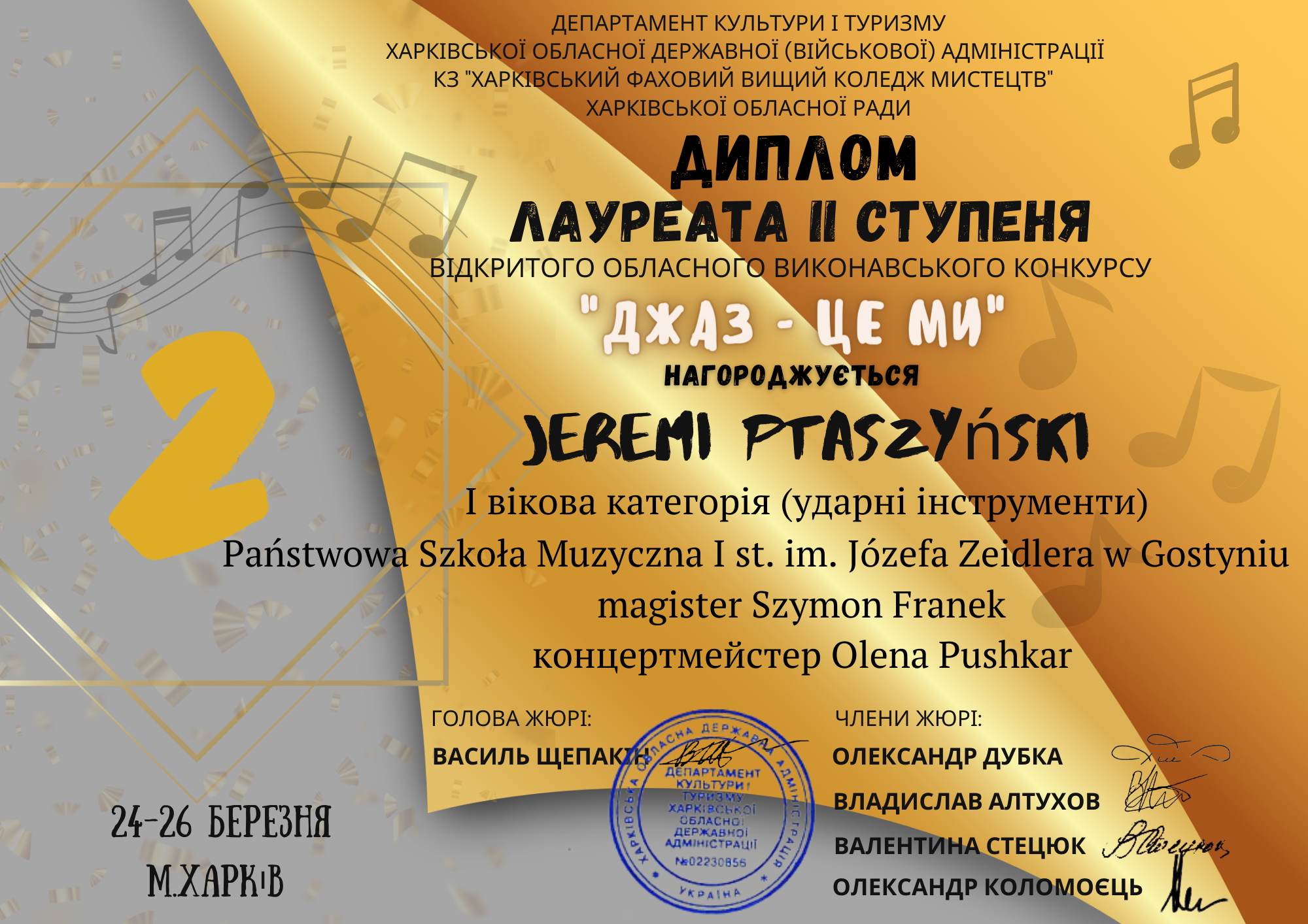 Uczniowie Adrian Hądzlik z klasy trąbki mgra Damiana Ruskowiaka oraz Jeremi Ptaszyński z klasy perkusji mgra Szymona Franka wzięli udział w międzynarodowym konkursie online pn. "Jazz to my" zorganizowanym przez Charkowską Artystyczną Szkołę Wyższą w Charkowie (Ukraina). Oto wyniki: