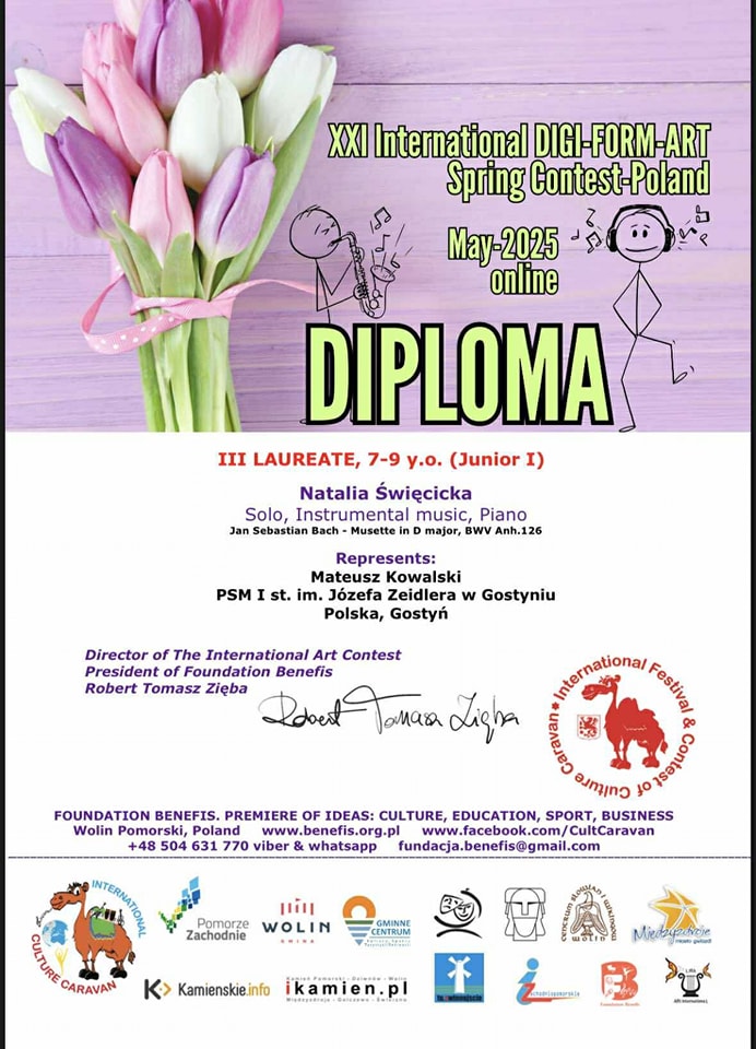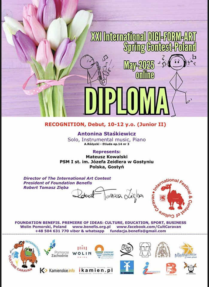 Podczas XXI International competition ,, Digi-Form-Art " w Wolinie uczniowie z klasy fortepianiu pana mgra Mateusza Kowalskiego zdobyli nagrody i wyróżnienia: