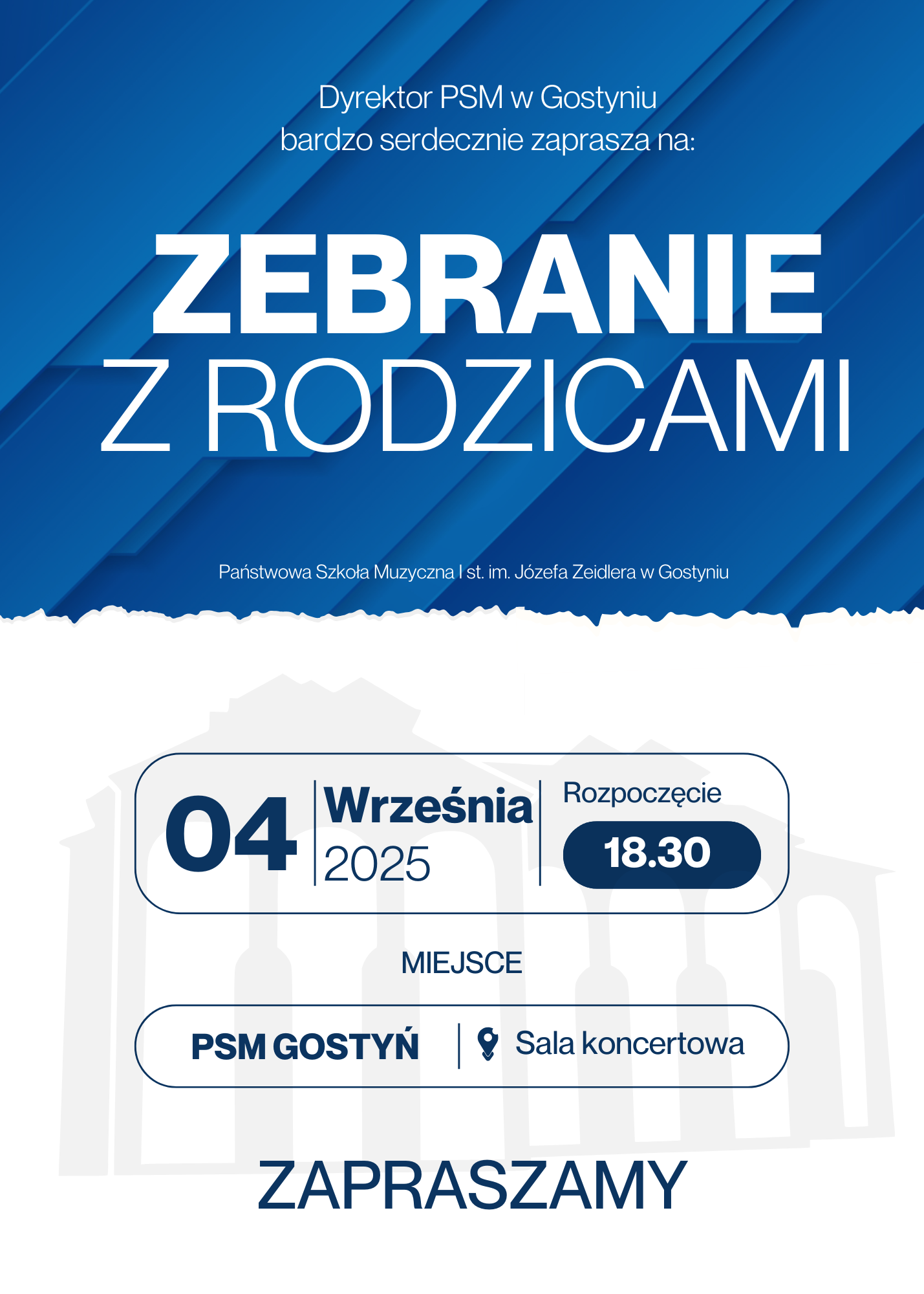 Pani Dyrektor Katarzyna Grzybowska zaprasza wszystkich Rodzciów na zebranie, w dniu 4 września 2025 r. w sali koncertowej szkoły.