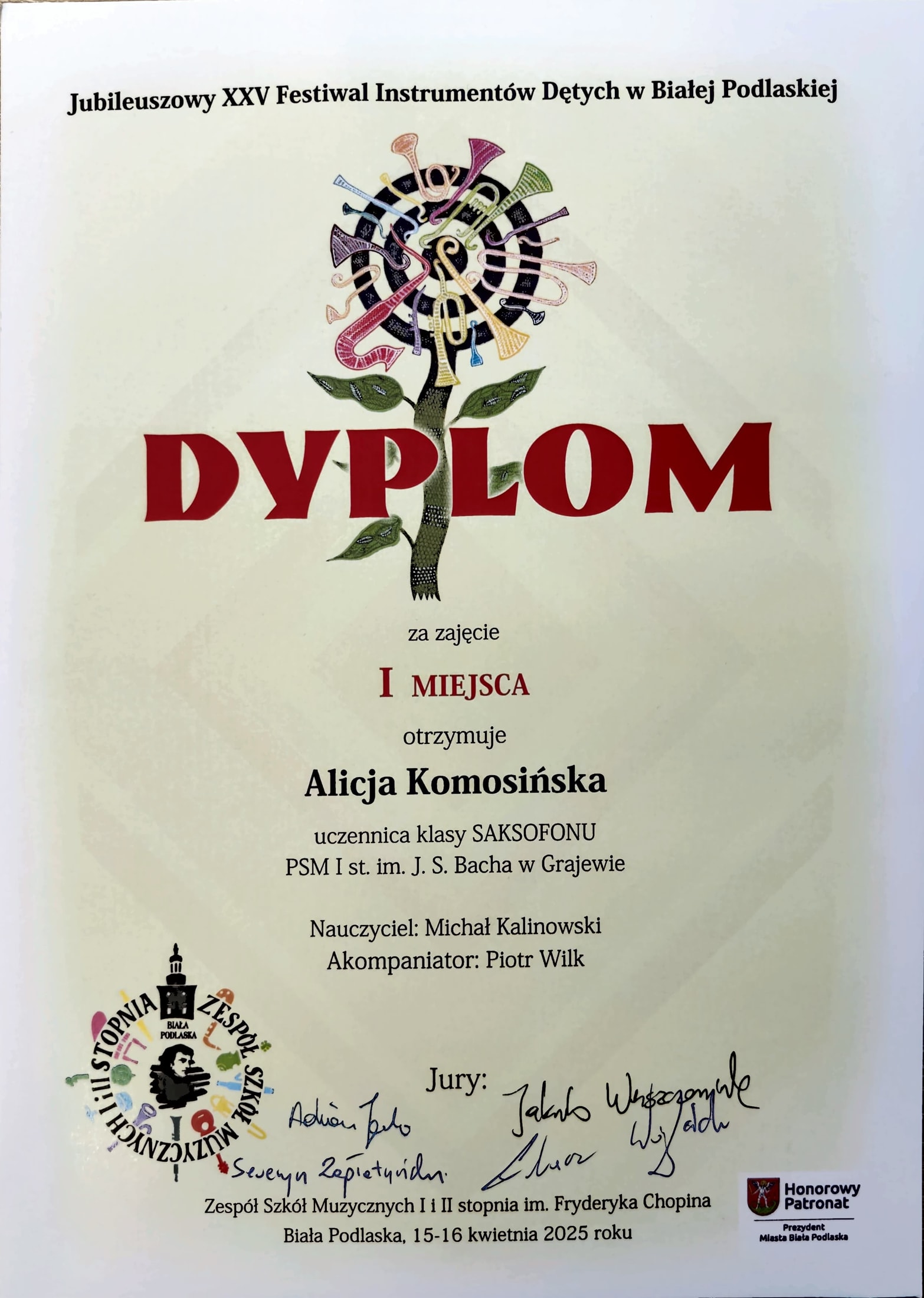 Alicja Komosińska - I miejsce w Jubileuszowym XXV Festiwalu Instrumentów Dętych w Białej Podlaskiej - 15-16 kwietnia 2025