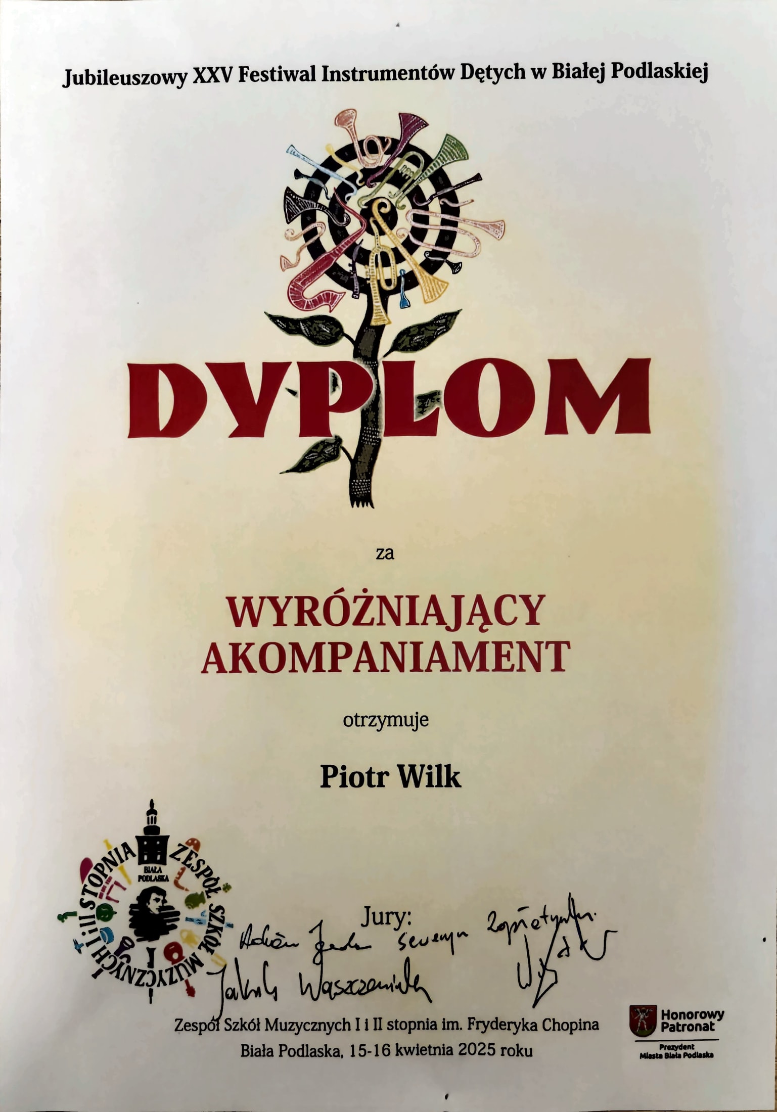 Przy fortepianie towarzyszył Piotr Wilk, który został nagrodzony dyplomem za wyróżniający akompaniament.