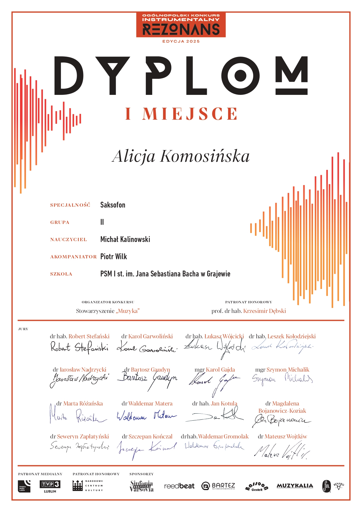 Alicja Komosińska - I miejsce w Ogólnopolskim Konkursie Instrumentalnym „Rezonans 2025” - edycja online