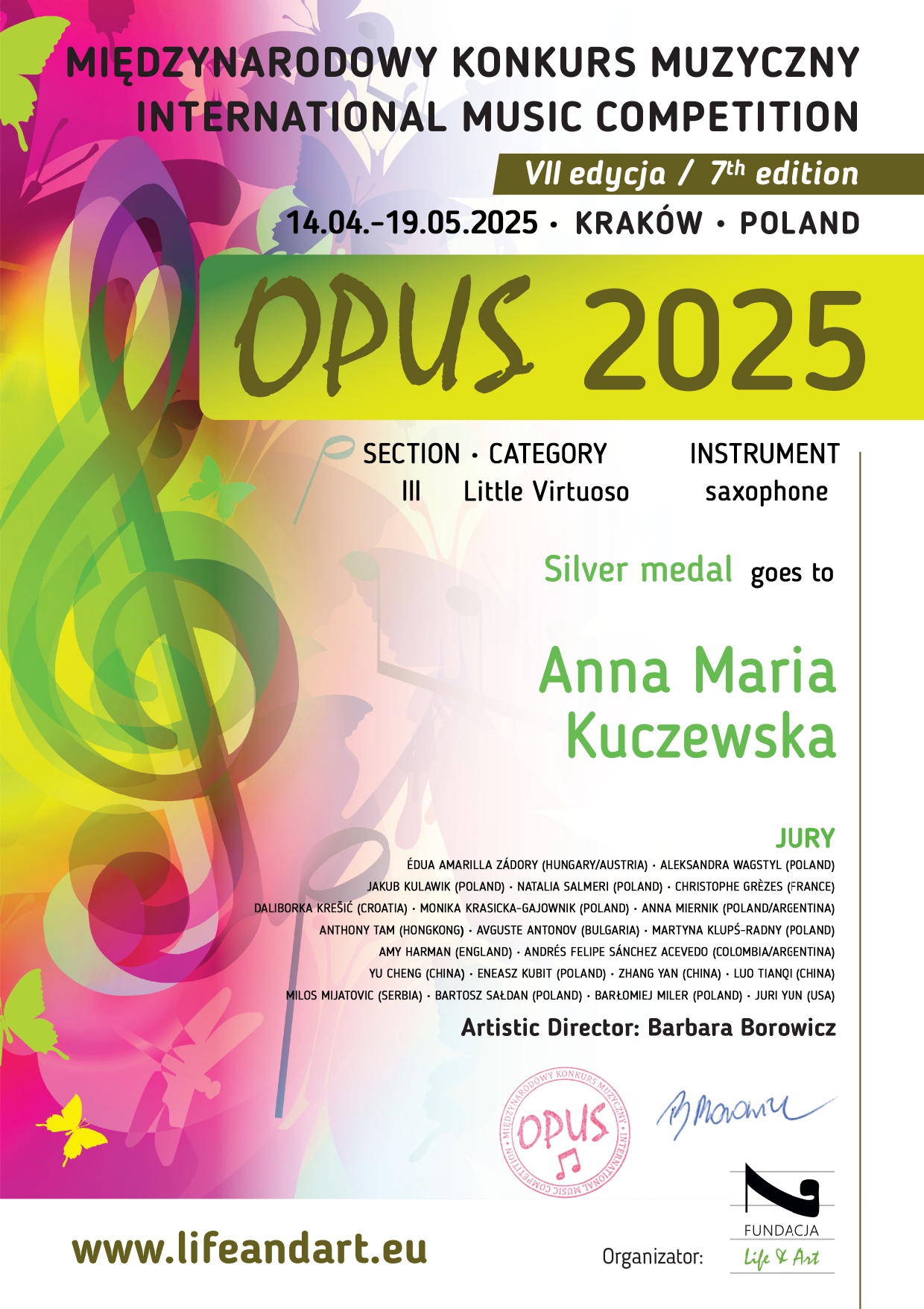 Anna Maria Kuczewska uhonorowana srebrnym medalem w VII edycji Międzynarodowego Konkursu Muzycznego OPUS 2025 w Krakowie - 14 kwietnia - 19 maja 2025