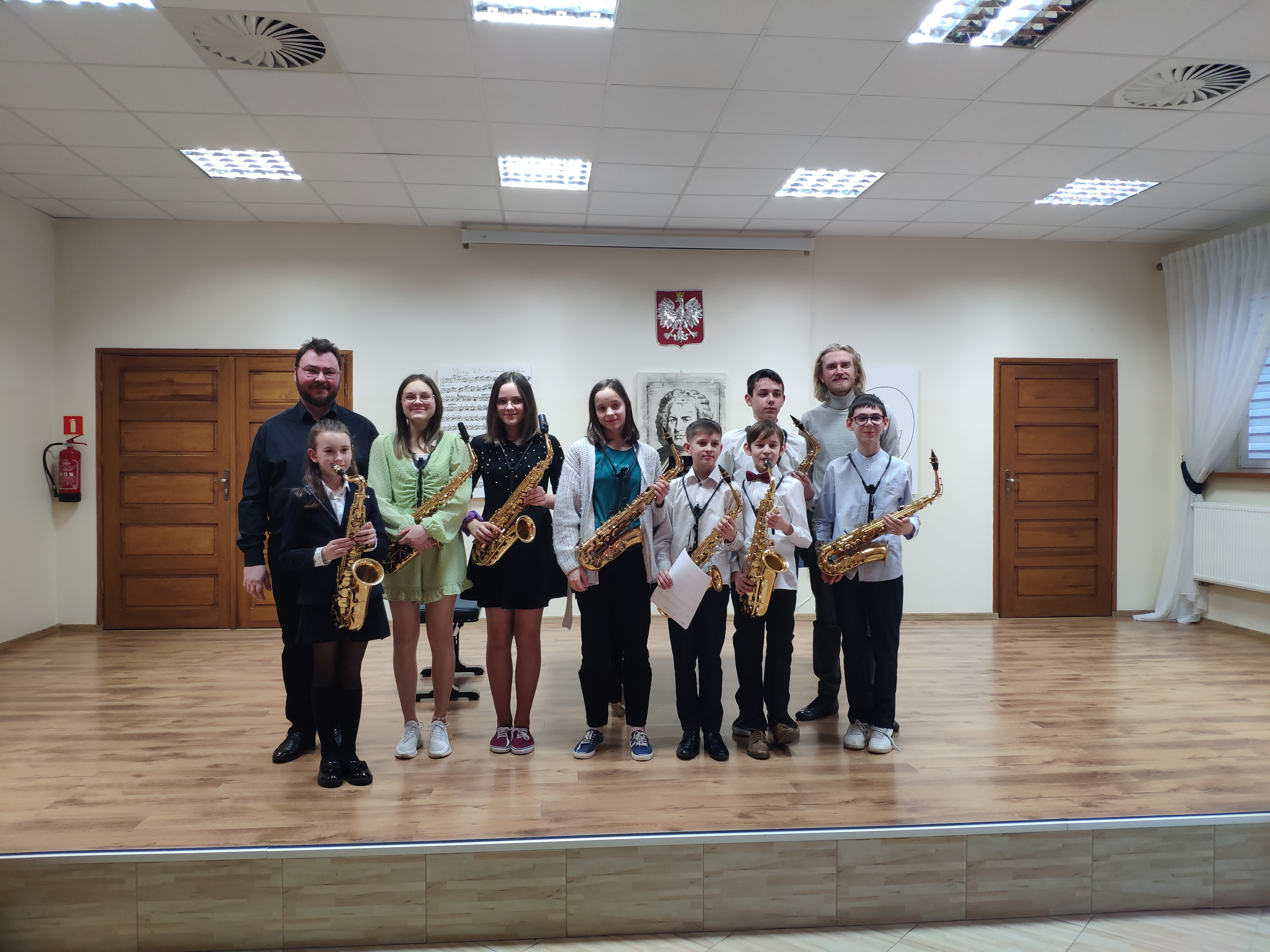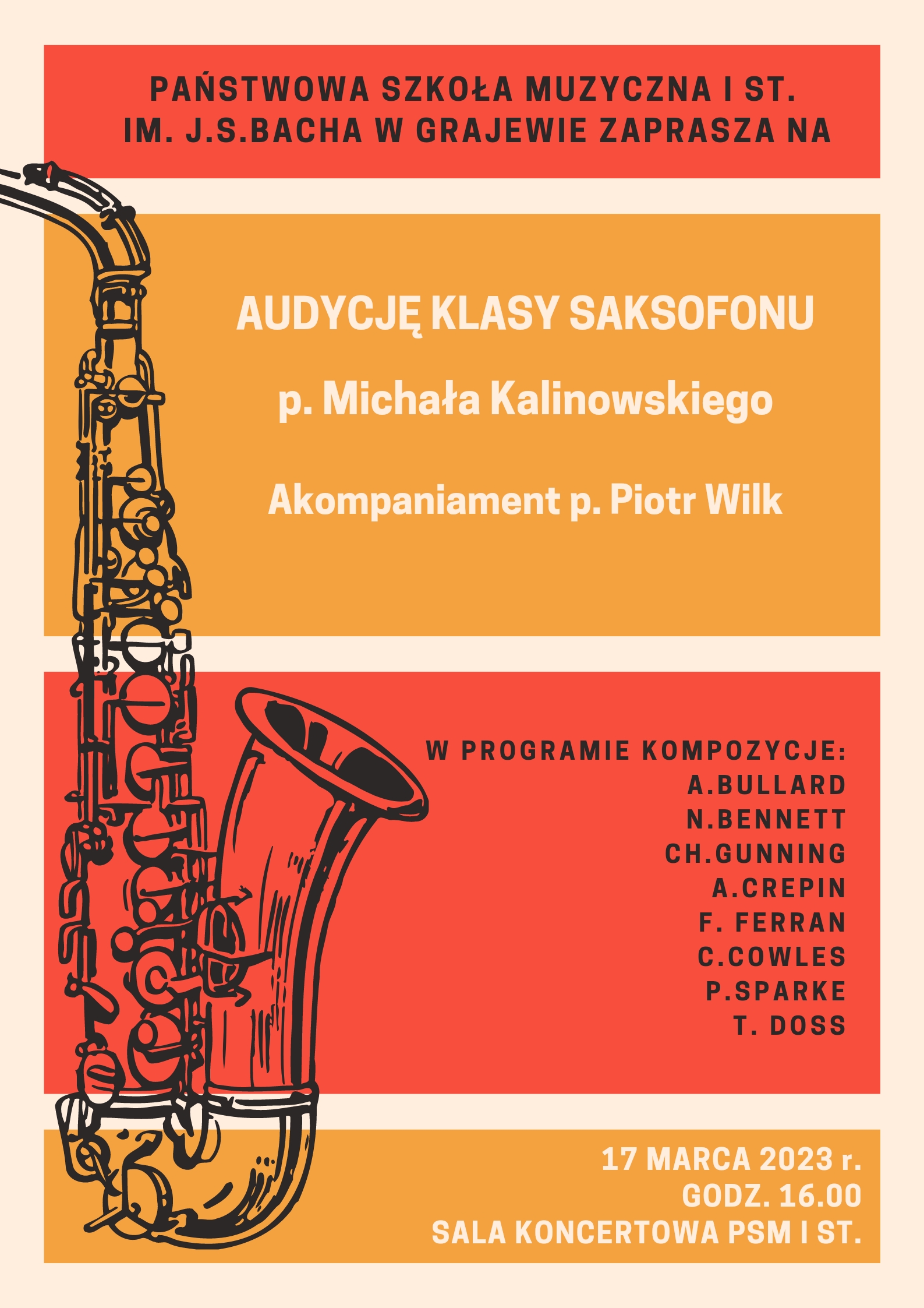 17 marca 2023 r. odbyła się audycja klasy saksofonu prowadzonej przez p. Michała Kalinowskiego. Zebrana podczas koncertu publiczność mogła wysłuchać bardzo zróżnicowanego repertuaru. Uczniowie zaprezentowali swoje umiejętności wykonując kompozycje mieszczące się w ramach muzyki klasycznej oraz jazzowej. Wszystkim adeptom sztuki saksofonowej akompaniował p. Piotr Wilk.