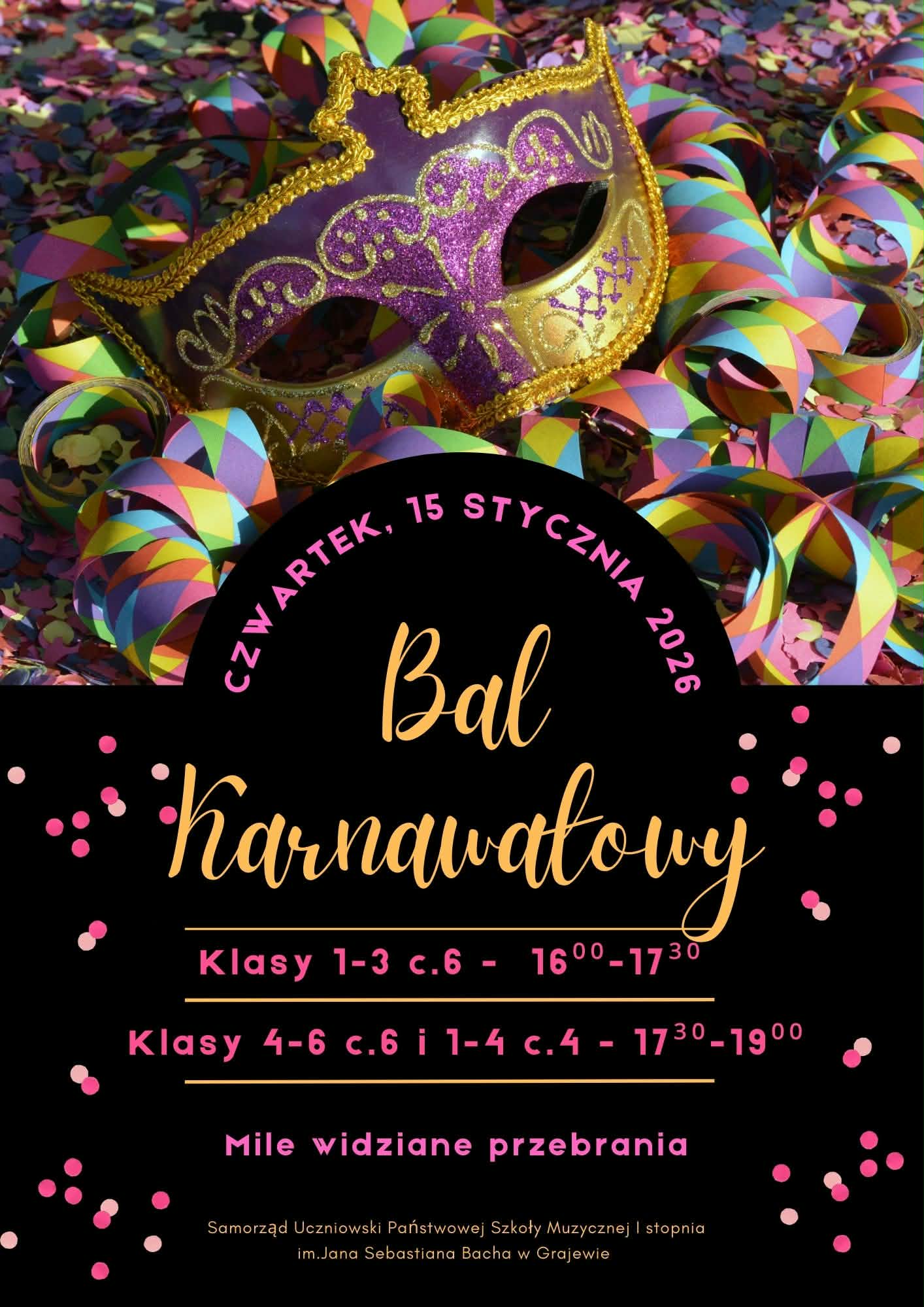 Samorząd Uczniowski serdecznie zaprasza wszystkich uczniów na Bal Karnawałowy, który odbędzie się 15 stycznia 2026 roku. Szczegóły na plakacie.
