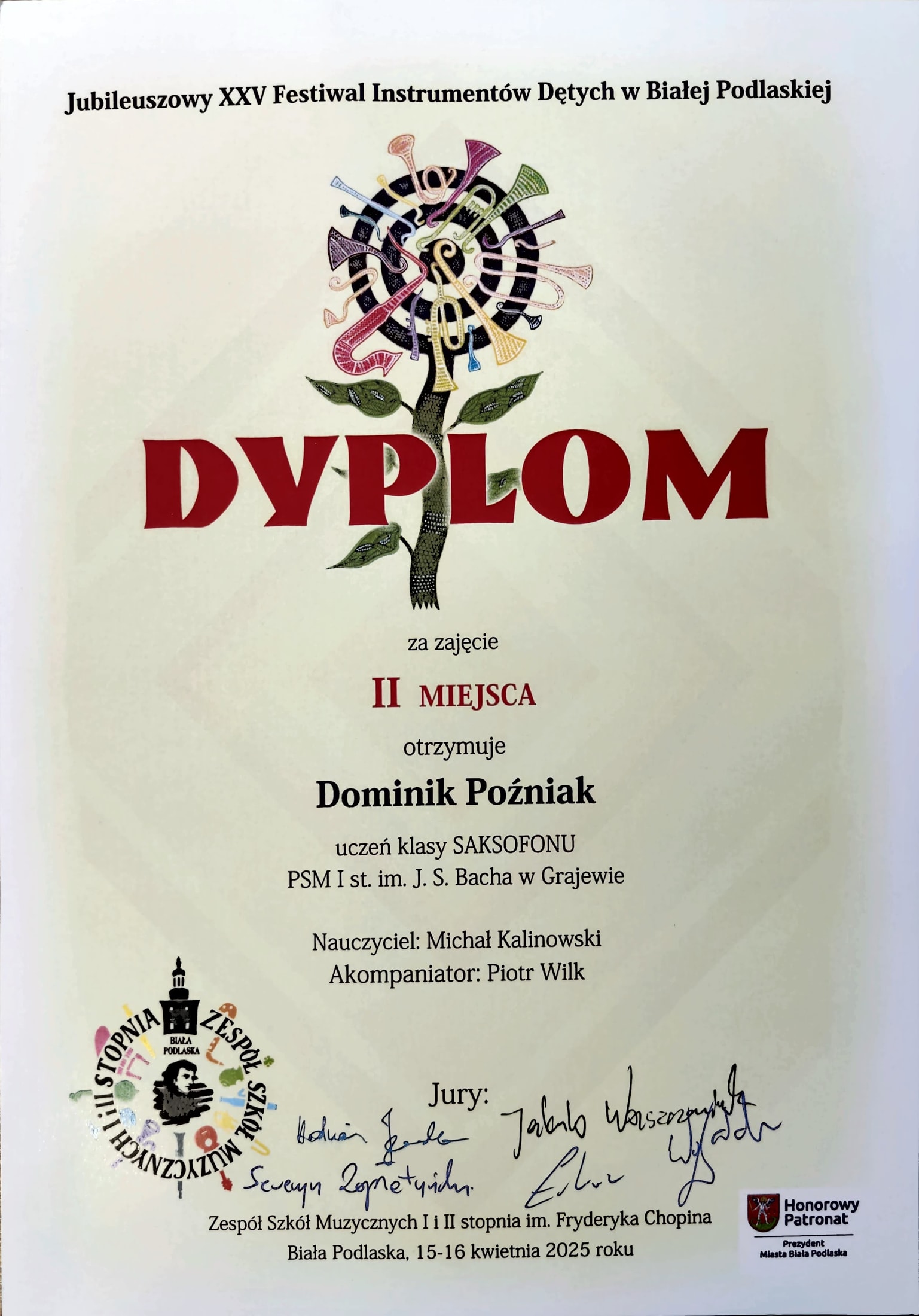 Dominik Poźniak - II miejsce w Jubileuszowym XXV Festiwalu Instrumentów Dętych w Białej Podlaskiej -15 - 16 kwietnia 2025