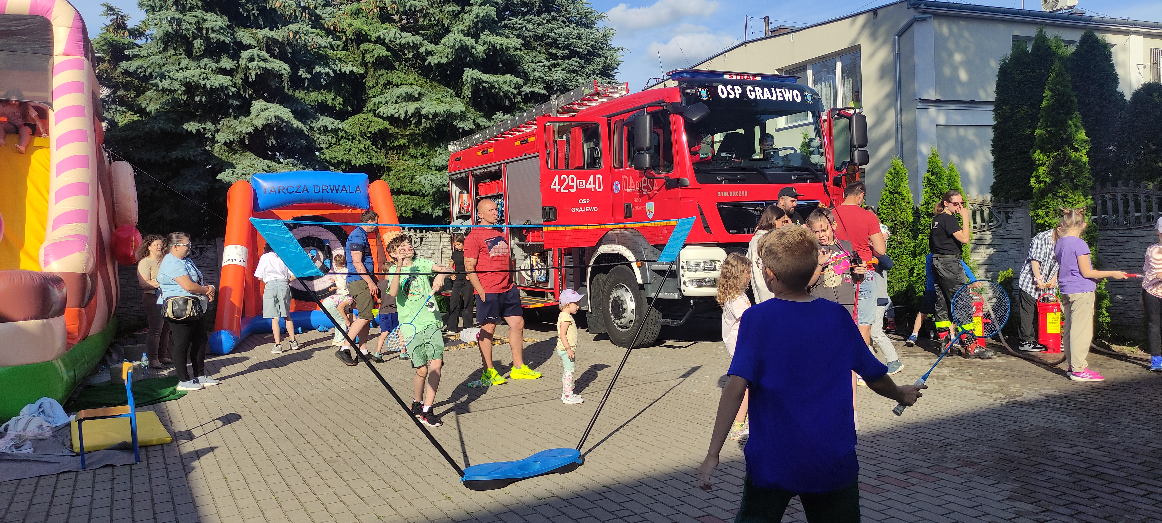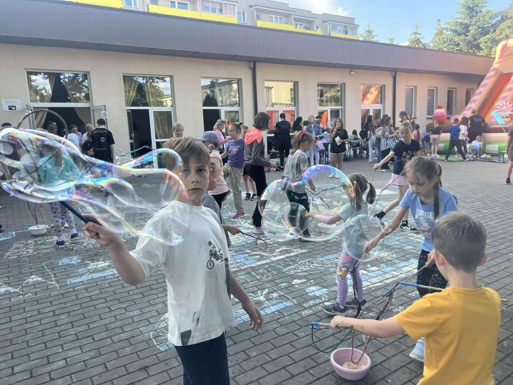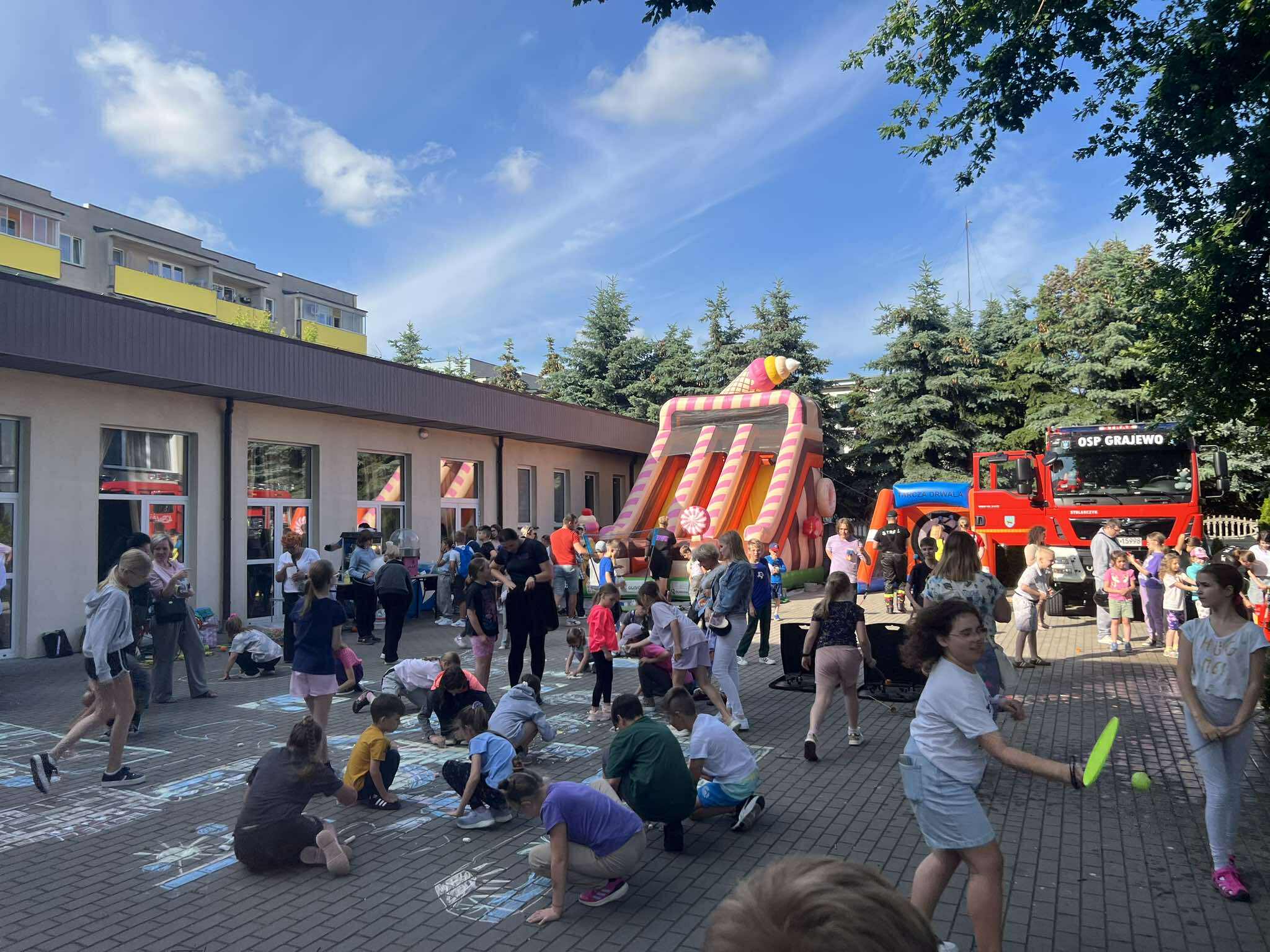 Na uczestników czekało wiele atrakcji: tańce, gry, zabawy, konkurencje sportowe, które sprawiły frajdę zarówno najmłodszym, jak i dorosłym. Dużym zainteresowaniem cieszyły się dmuchańce, pokazy strażackie a także słodkie przekąski – wata cukrowa i popcorn oraz loteria zorganizowana przez Radę Rodziców.