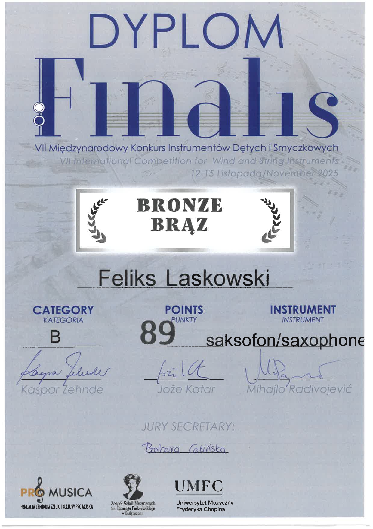Feliks Laskowski - brąz w kategorii A - VII Międzynarodowy Konkurs Instrumentów Dętych i Smyczkowych FINALIS - 12-15 listopada