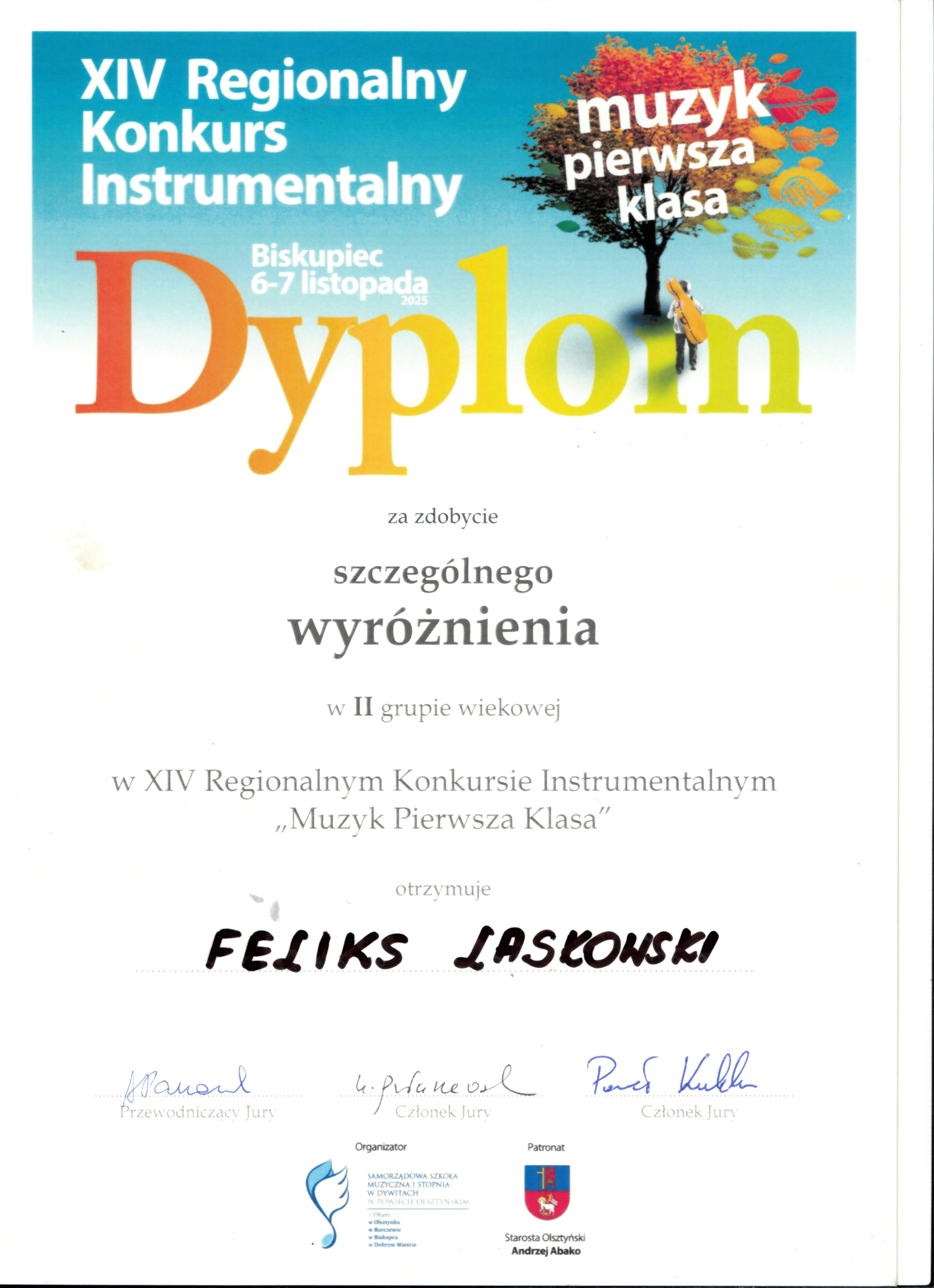Feliks Laskowski - wyróżnienie szczególne w II kategorii- XIV Regionalny Konkurs Instrumentalny Muzyk Pierwsza Klasa - 6-7 listopada Biskupiec