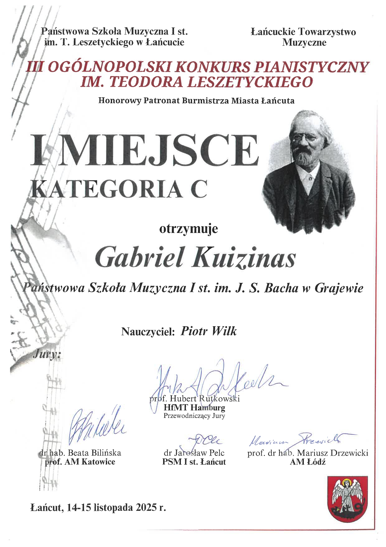 Gabriel Kuizinas - I miejsce - III Ogólnopolski Konkurs Pianistyczny im. Teodora Leszetyckiego - 4-15 listopada 2025 Łańcut