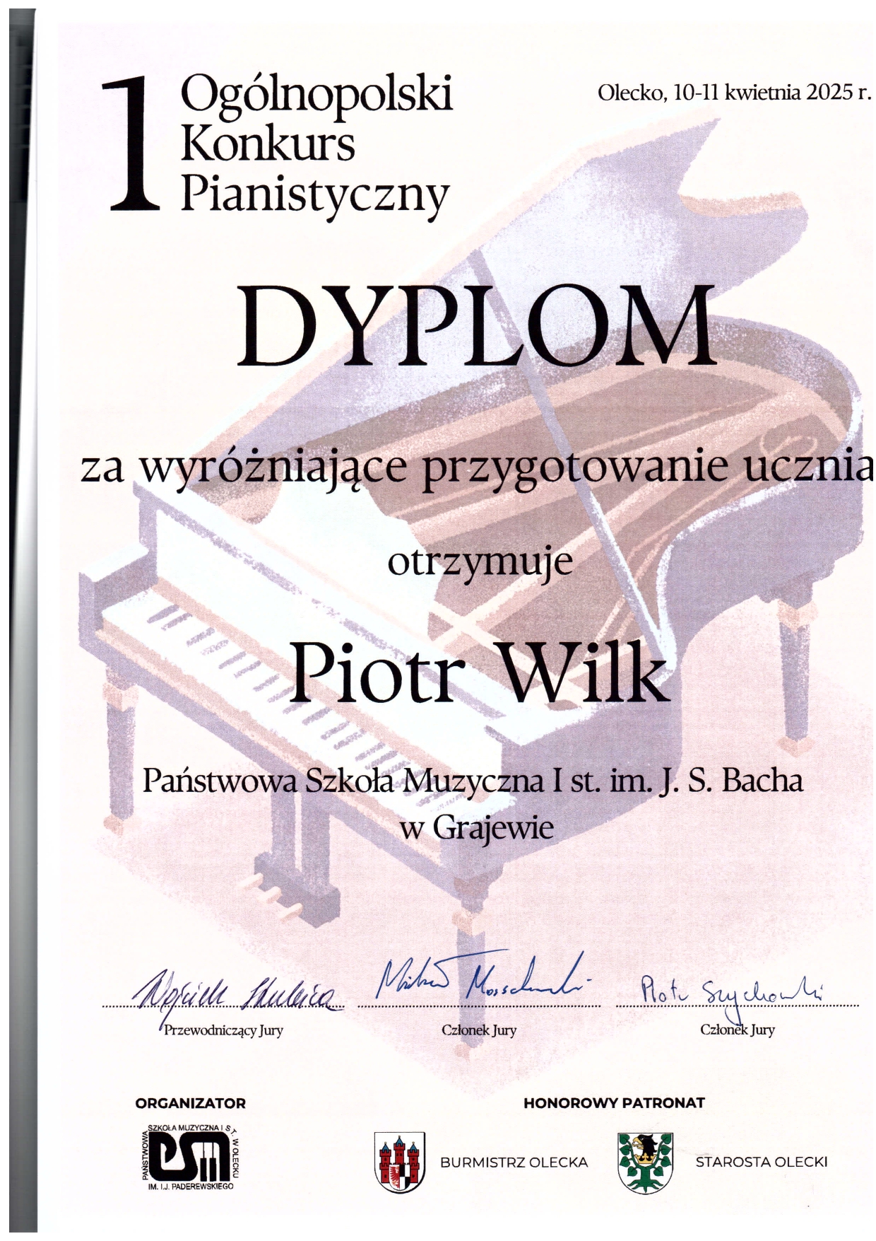Ponadto, konkurs uhonorował również p. Piotra Wilka, przyznając mu dyplom za wyróżniające przygotowanie ucznia. To dowód na to, że konkurs nie tylko nagradza indywidualne osiągnięcia, ale również docenia pracę pedagogów i nauczycieli, którzy kształtują młode talenty.